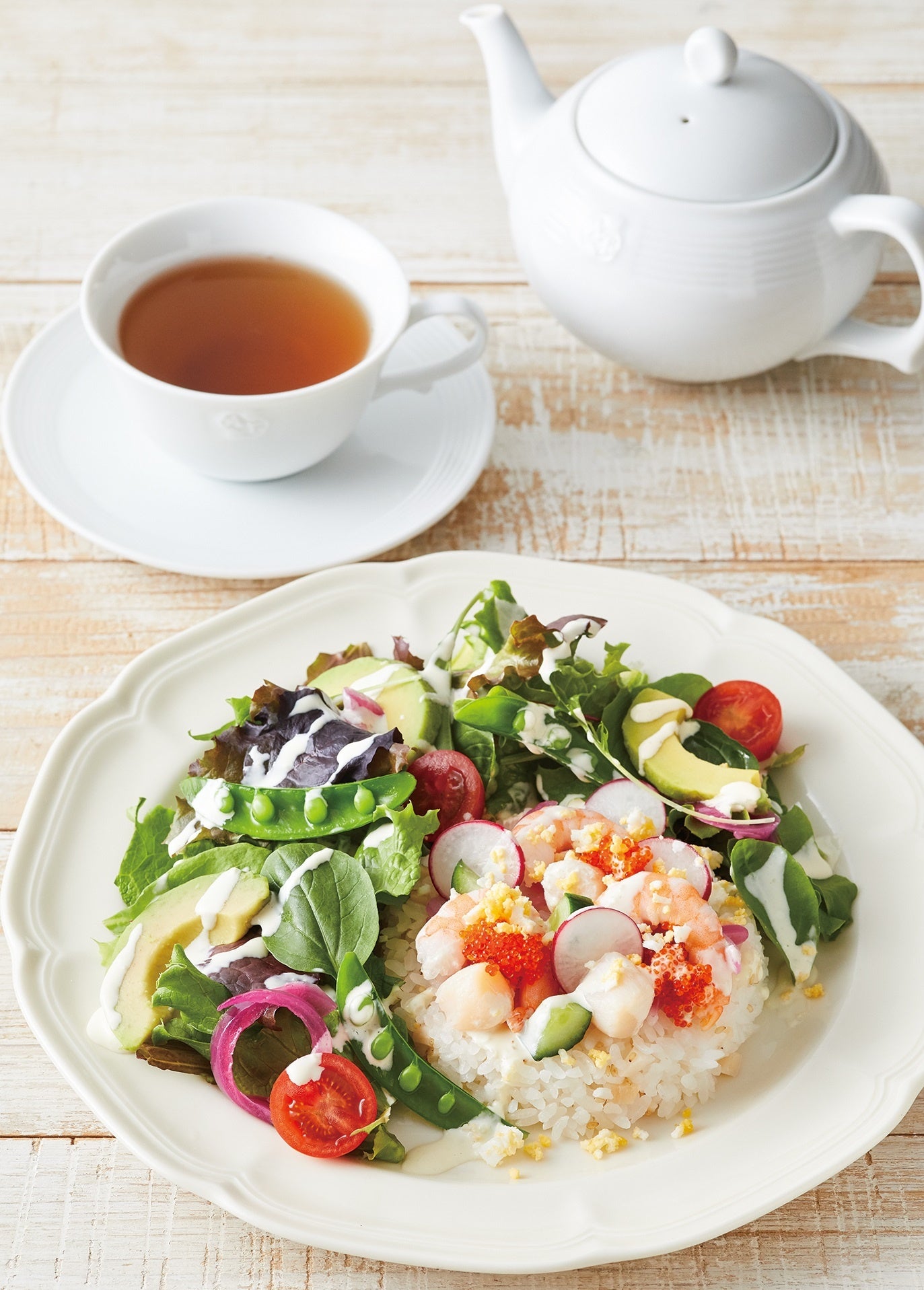 海老、とびっこ、小柱などを、だいだい酢で酸味をつけたごはんに乗せました。アボカドやスナップえんどうをトッピングしたサラダをわさびマヨネーズドレッシングで。