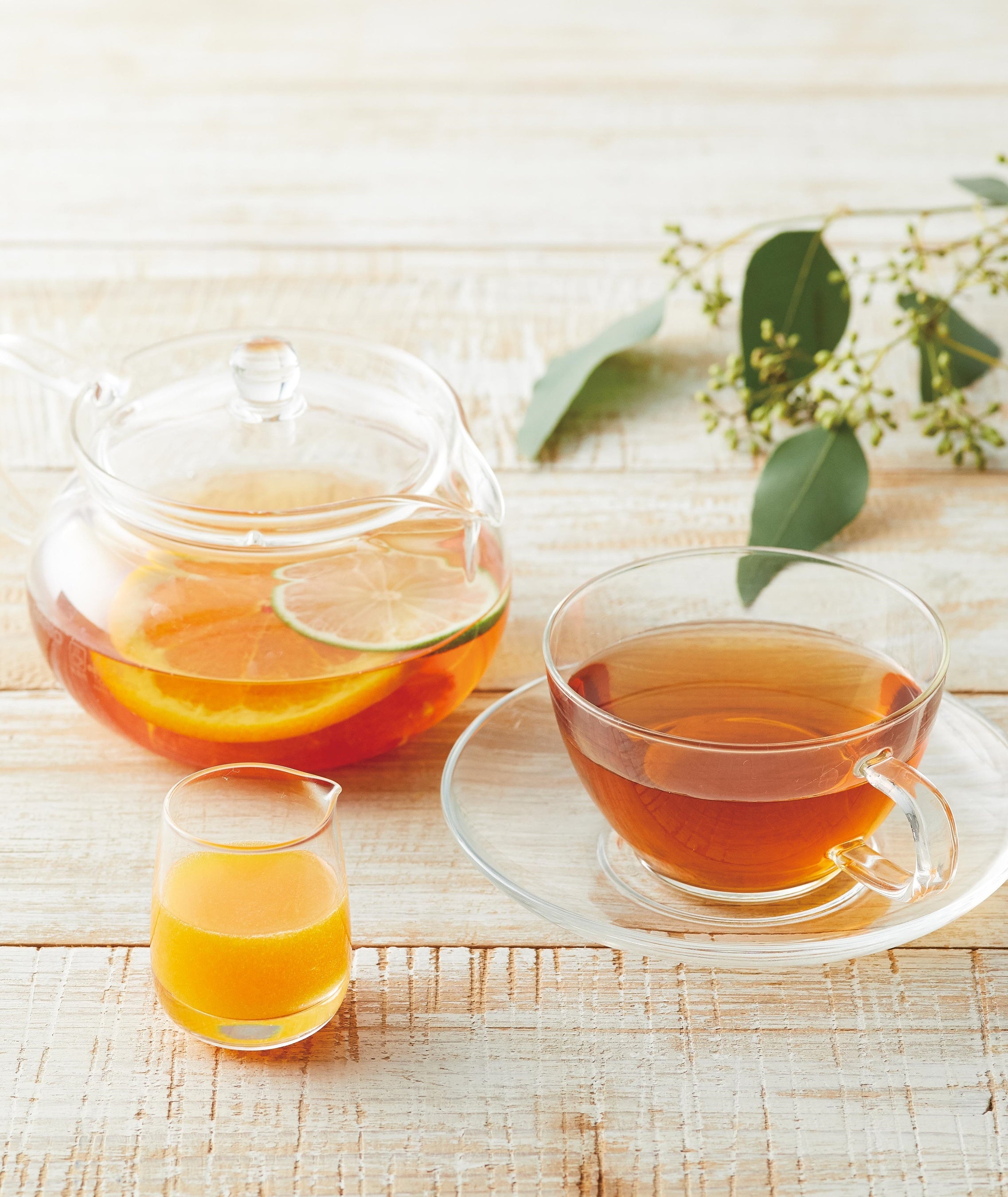 レモンマートルをブレンドしたレモンとアールグレイの爽やかな香りのお茶に、3種類の柑橘を浮かべました。温州みかんのソースを添えて。