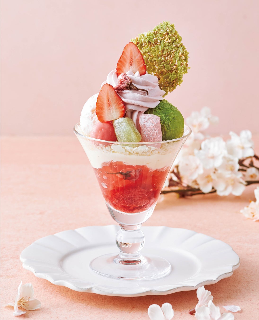 さくらミルクアイス、抹茶アイス、さくらホイップ、苺を、ストロベリーコンフィチュール、さくらゼリー、ヨーグルトカスタードに重ねて。塩漬けしたさくらの花をトッピング。