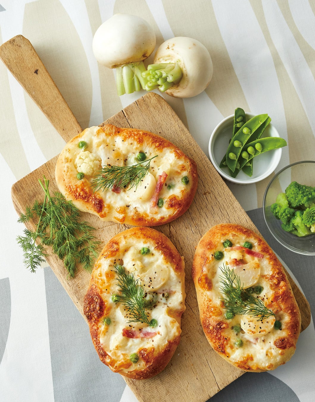 かぶ、カリフラワー、ロマネスコ、グリンピース、ベーコンをのせて焼き上げたグラタンピッツァ。