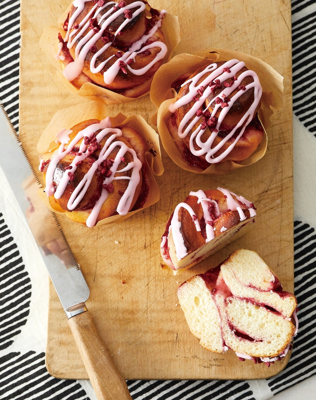 木苺ジャムを巻き込んで焼き上げました。木苺のアイシングをトッピング。