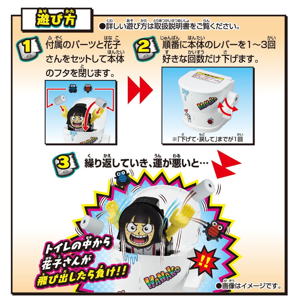 トイレのレバーを1~3回、好きな回数を下げて次の人に交代し、繰り返していきます。運が悪いと突然「花子さん」「虫」「トイレットペーパー」が飛び出し、飛び出した人が負けになる、ビックリ!ドッキリ!のアクションゲームです。怖いけど面白い!がクセになります。