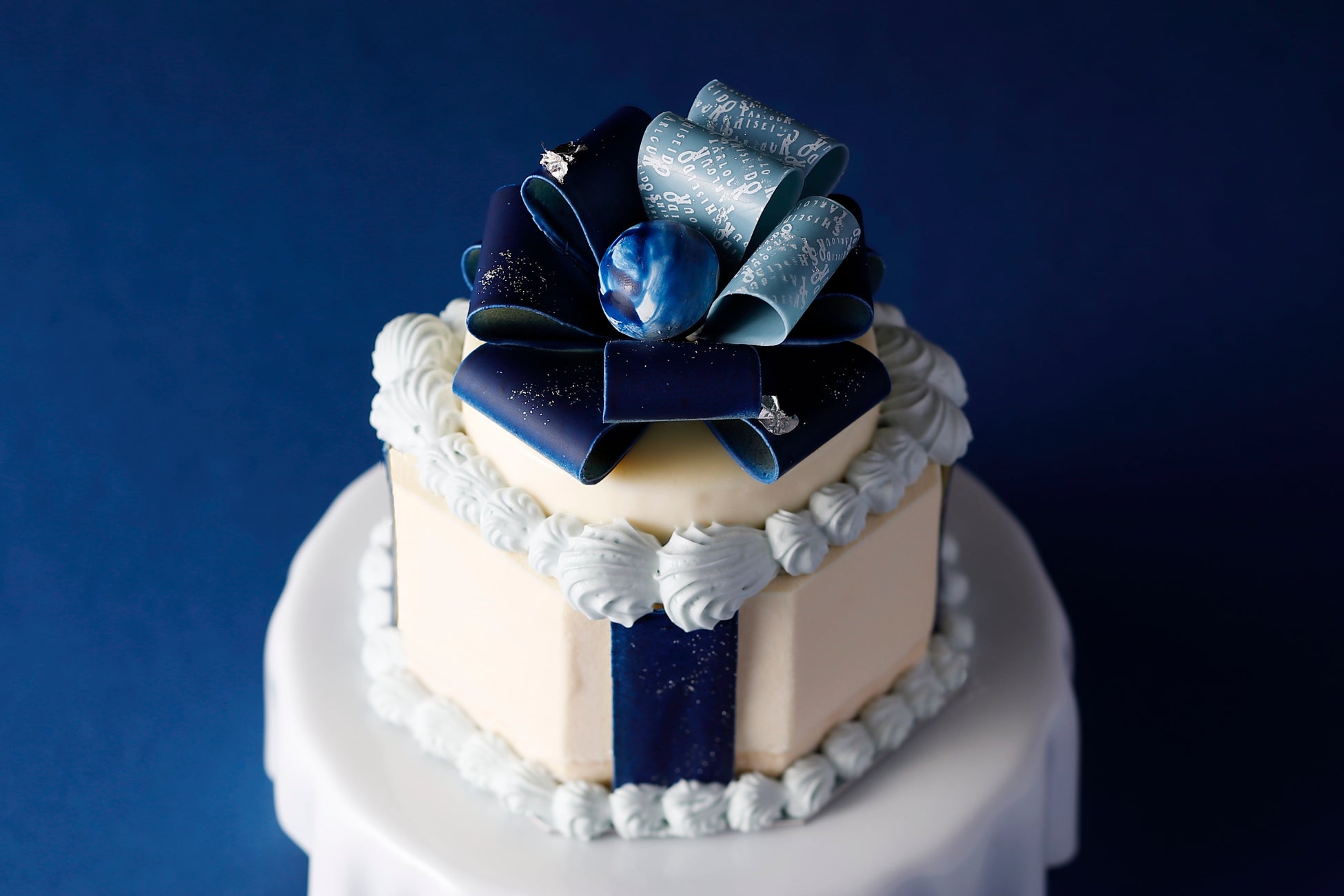 クリスマスの夜空をイメージしたカラーで贈り物のように仕立てました。ショコラブランのムースをメインに、チーズケーキやブルーベリージュレの爽やかな風味をアクセントにした濃厚なホワイトチョコレートのケーキです。