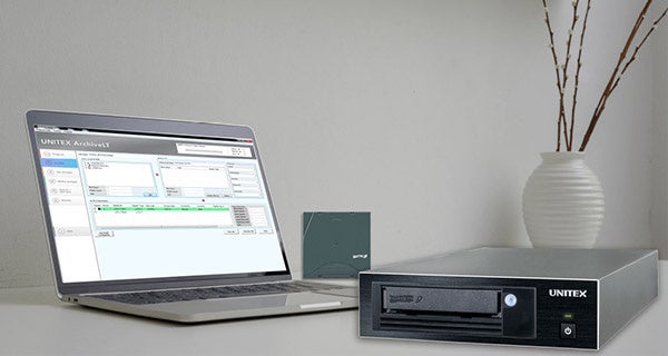 ユニテックス独自のデータスストレージ技術で開発されたUSB接続LTOテープ装置はノートPCをはじめとするUSB機器に接続するだけで、誰にでも簡単に、場所を選ばずどこででも、スモールスタートで大容量データの長期保存を可能とします。