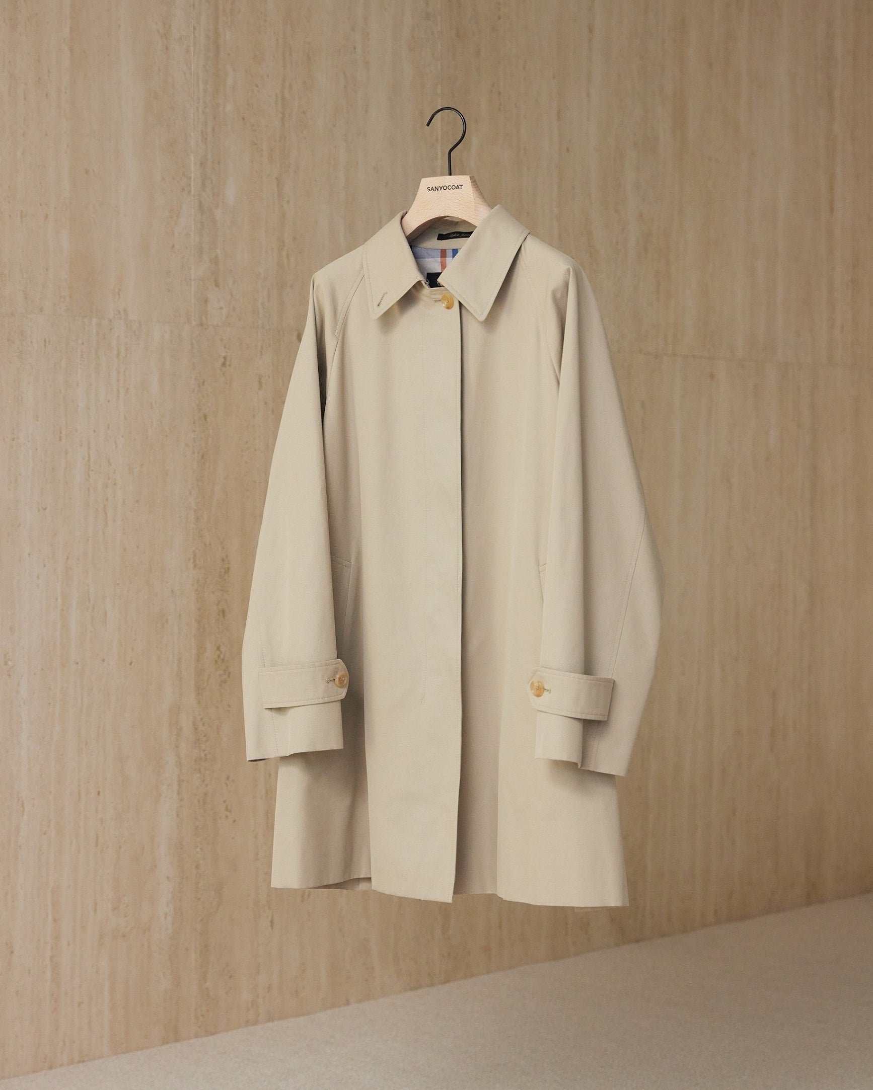「サンヨーコート」は、ビジネスからカジュアルまで幅広いシーンで楽しめるこの一着を通じて、温暖化時代の新しいコートスタイルを提案します。80周年の節目を迎え、今後も伝統と革新を融合し、時代のニーズに沿ったコートをつくり続けます。