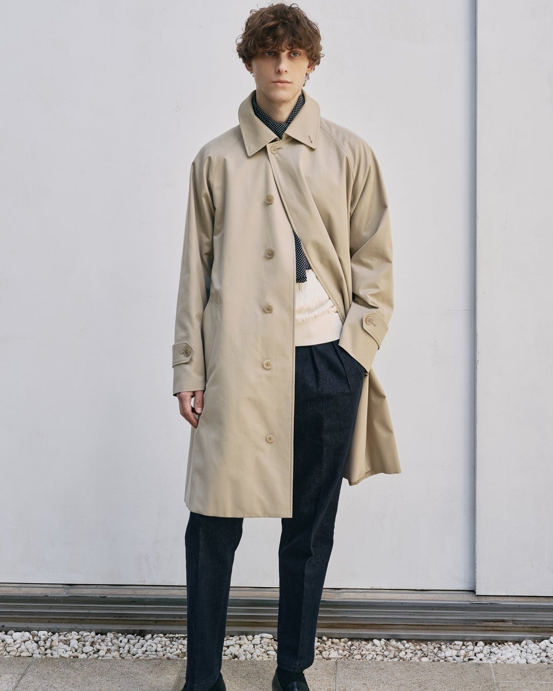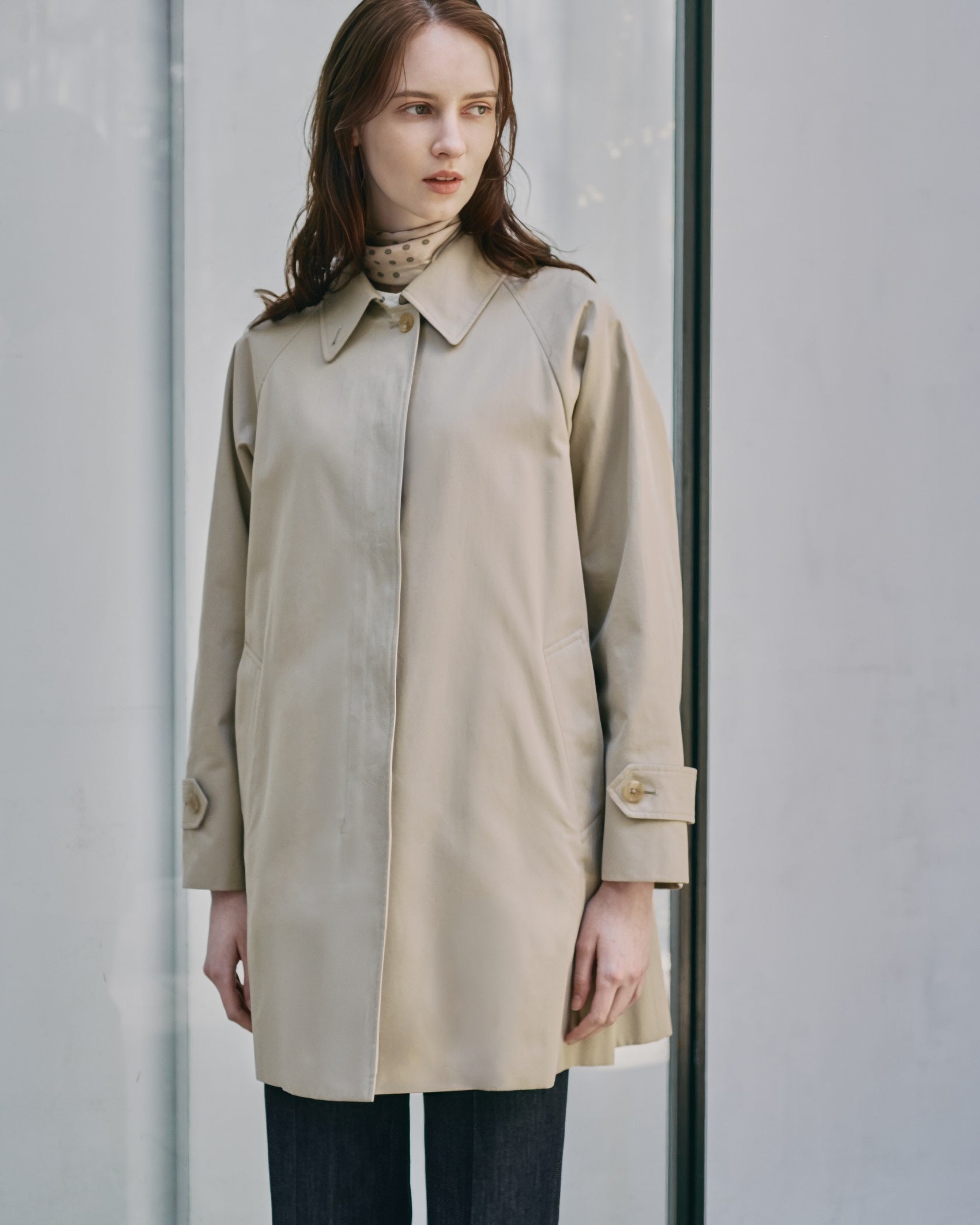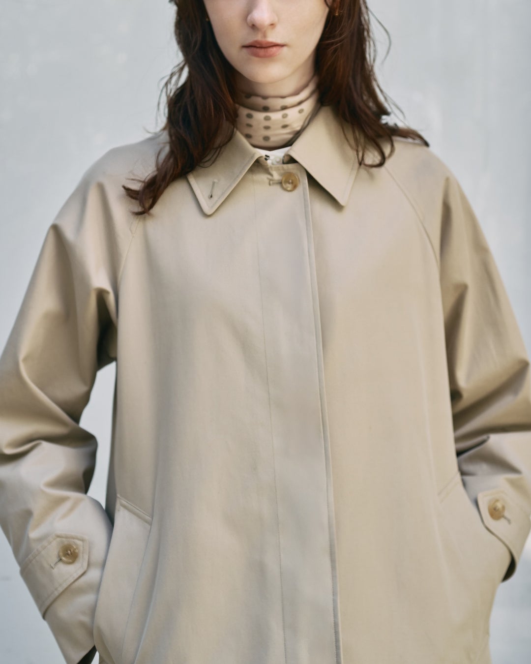 比翼仕立てでミニマルなデザインのバルマカーンコート。後身頃に深く入れたインバーテッドプリーツにより、優雅に広がるテントラインシルエットが特徴。襟の形状は丸みをもたせ、フレンチビンテージのような柔らかく洗練された雰囲気に仕上げています。腰ポケットのボタンは省きシンプルにしつつ、貫通式ポケット(※2)とマガジンポケット(※3)を備えた本格仕様です。
