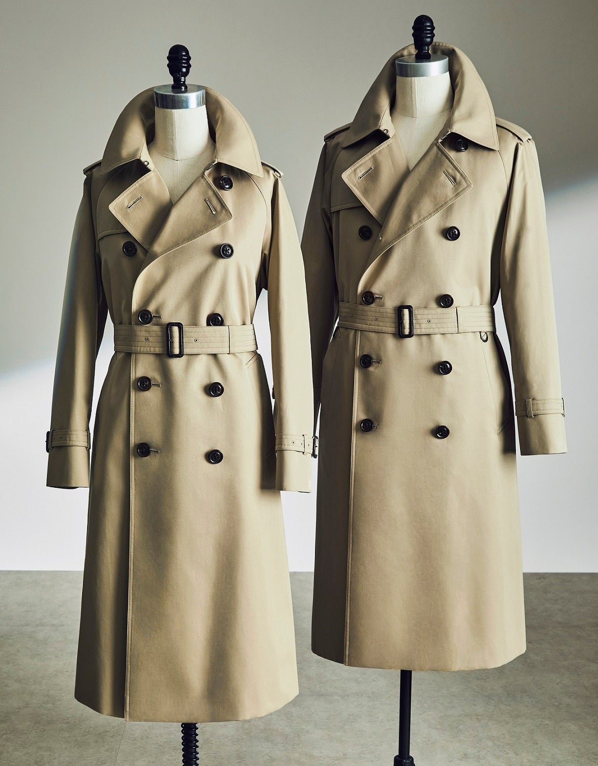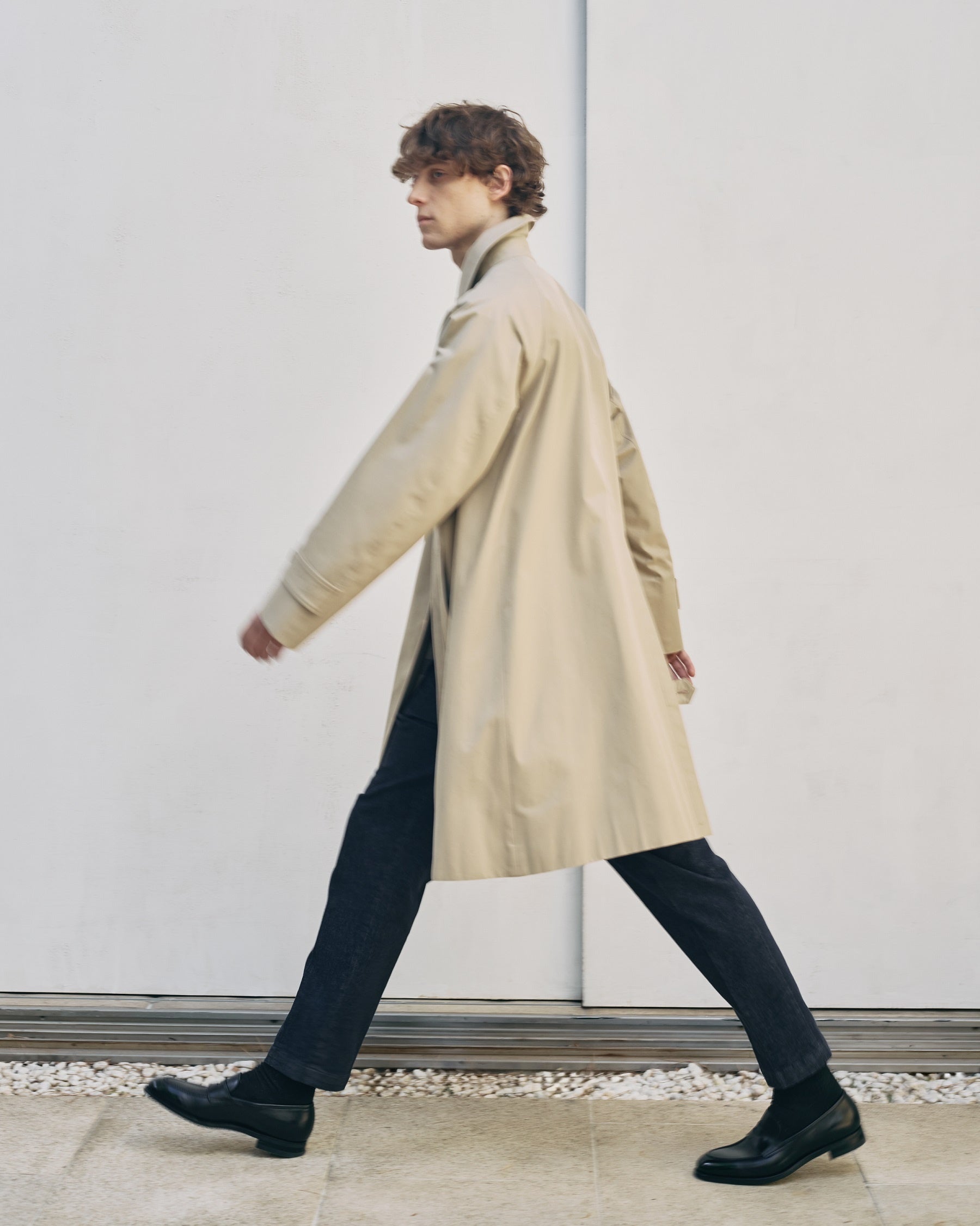 既存の『100年コート』スタンダードモデルより生地重量を15%軽量化した耐久はっ水性をもつコットンギャバジン生地を開発。ライナーをなくした総裏仕立てで軽やかに羽織れます。比翼仕立てのミニマルデザインに、後身頃のインバーテッドプリーツによる優雅なテントラインシルエットが特徴で、丸みを帯びた襟により洗練された雰囲気に仕上げています。コート専業57年の自社工場「サンヨーソーイング 青森ファクトリー」で生産し、職人による手縫いや空中プレスなどの技術により、軽やかさと立体感を両立させました。ビジネスはもちろん、休日のカジュアルスタイルにも合わせやすく、温暖化が進む現代でも本格的な仕立てのコートを気軽に楽しめる一着です。