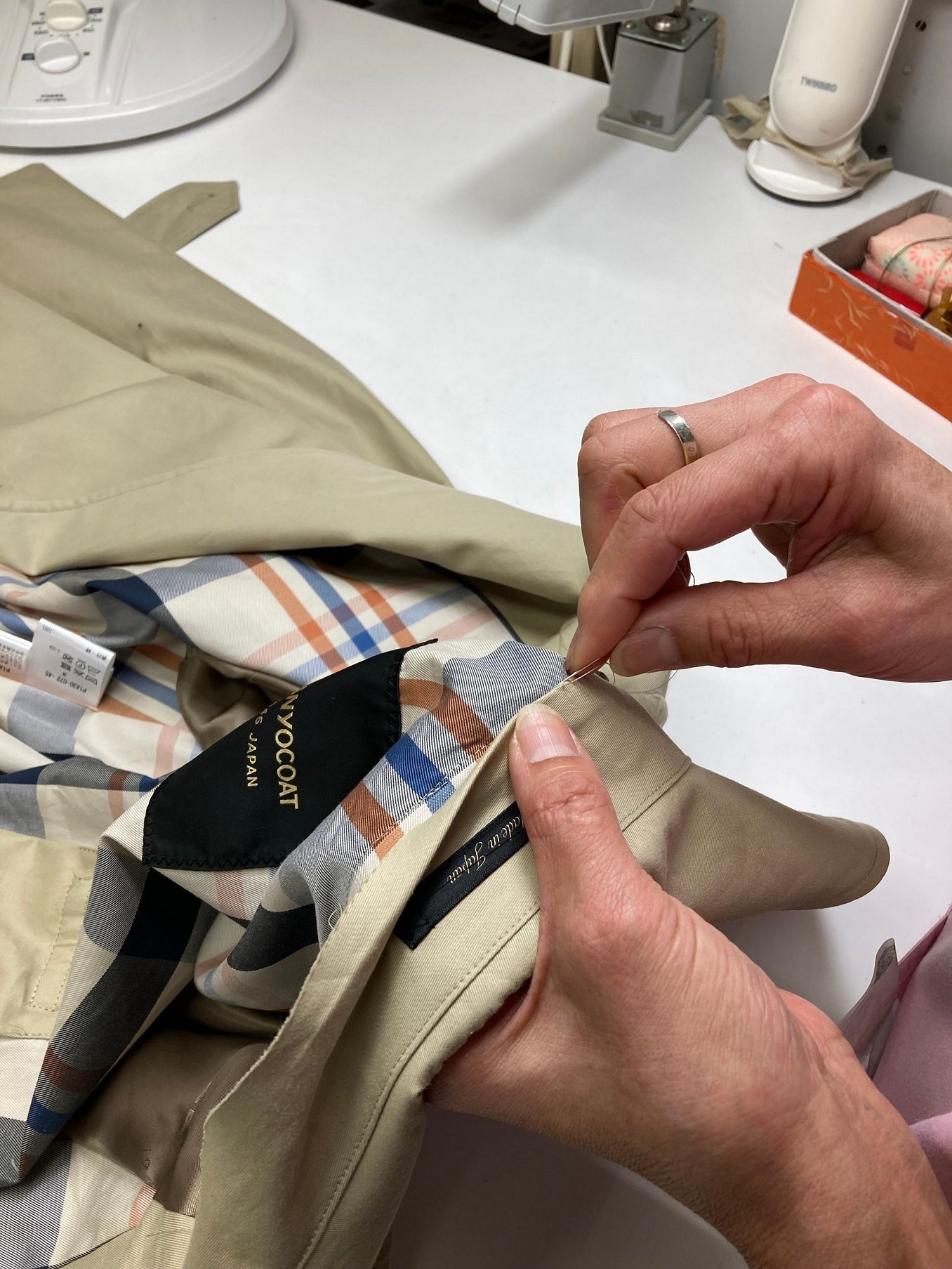 また、『100年コート』をご購入したお客さまが安心して愛用し続けることができるよう、メンテナンスやアフターケアを直接おこなう「100年オーナープラン」を運営しています。そのサービスの一環として、『100年コート』の購入から3年ごとのシーズンオフ期間にコートをお預かりし、10項目において定期診断を行い、無償でボタンの緩み直し補修を行うほか、ご希望に応じて袖口や裾周りの擦り切れ補修などを有償にて承る「100年オーナープラン・ケアプログラム」を提供しており、多くのお客さまにご登録いただいております。