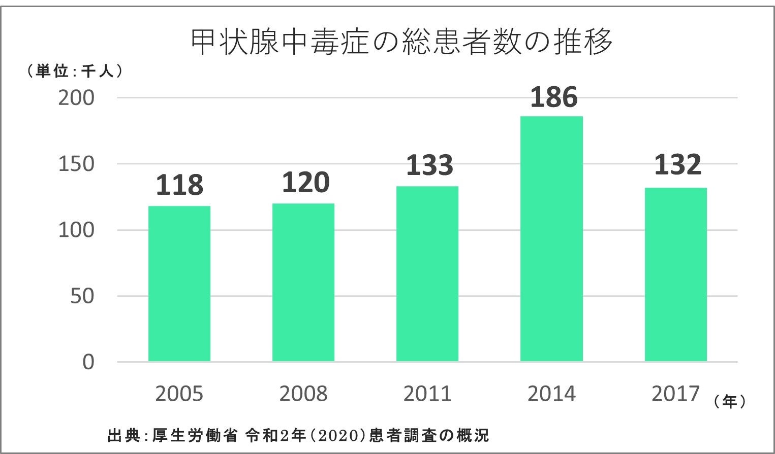 甲状腺ホルモンは、のどぼとけの下にある甲状腺という臓器から分泌されて、血液を通じて心臓や肝臓、腎臓、脳など全身に運ばれ、身体の新陳代謝を調整する働きをしています。そのため、甲状腺が活発化し、甲状腺ホルモンの分泌が過剰になる(甲状腺機能亢進症)と、動悸、頻脈、倦怠感、抜け毛などといった症状が現れ、日常生活や社会生活の質を低下させることが知られています。甲状腺機能亢進症の代表的な疾患にバセドウ病があります。バセドウ病の発生頻度は高く、厚生労働省の調査では2017年のバセドウ病を含む甲状腺中毒症の総罹患数は13.2万人と報告されています。