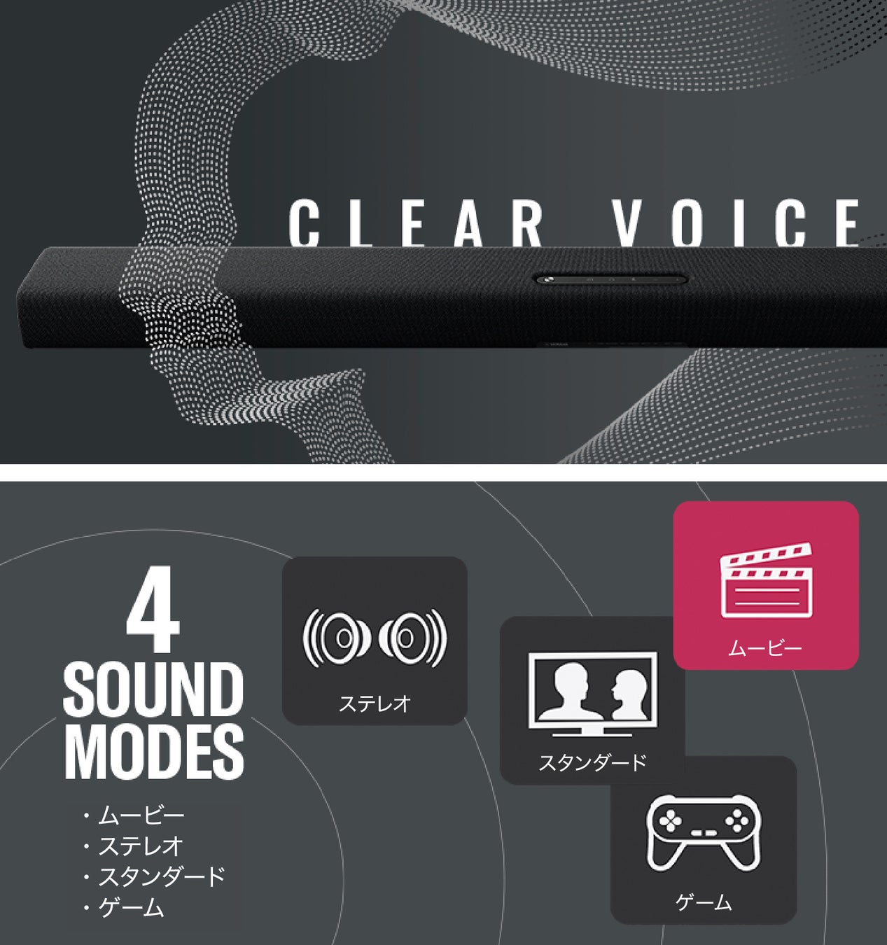 テレビの音をより聴きやすくする「クリアボイス」&低音増強機能「バスエクステンション」、コンテンツに合せて最適な音場を選べる4つのサウンドモードを搭載
