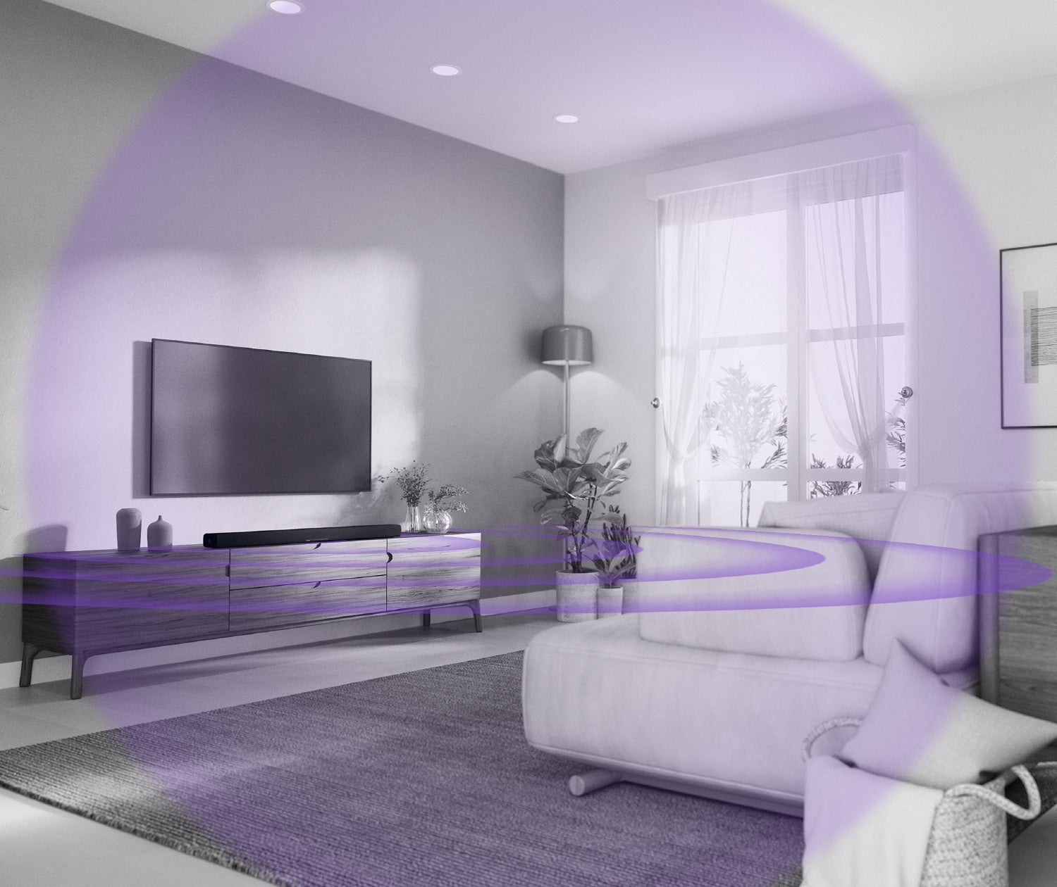 横幅101.5cmの本体は、大型テレビにマッチするサイズ感でありながらも、高さは6.3cmに抑えたスリムなデザインを採用しました。空間にスッキリ置くことができ、壁掛け設置などにも対応します。さらに外観にはインテリアに自然と馴染むファブリック素材を使用したうえ、操作ボタンやポート周りなどの細部にまでこだわって仕上げることでどこから見ても美しい外観を実現し、お部屋をスタイリッシュに演出します。