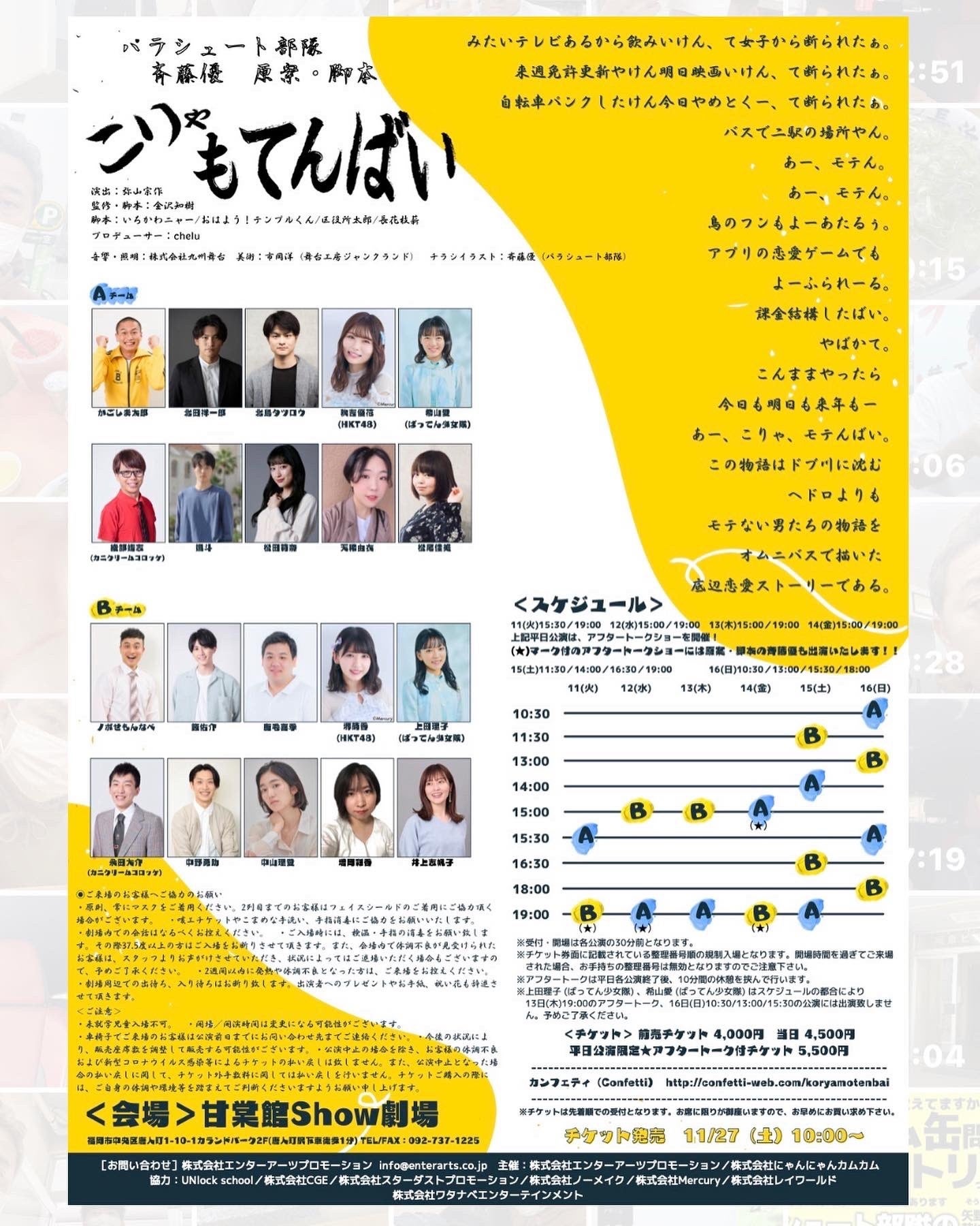 ワタナベエンターテインメント所属 お笑いコンビ・パラシュート部隊の斉藤優の原案・脚本の『こりゃもてんばい』が2022年1月11日 (火) ~2022年1月16日 (日)に甘棠館Show劇場(福岡県福岡市)にて上演されます。チケットはカンフェティ(運営:ロングランプランニング株式会社、東京都新宿区、代表取締役:榑松 大剛)にて発売中です。