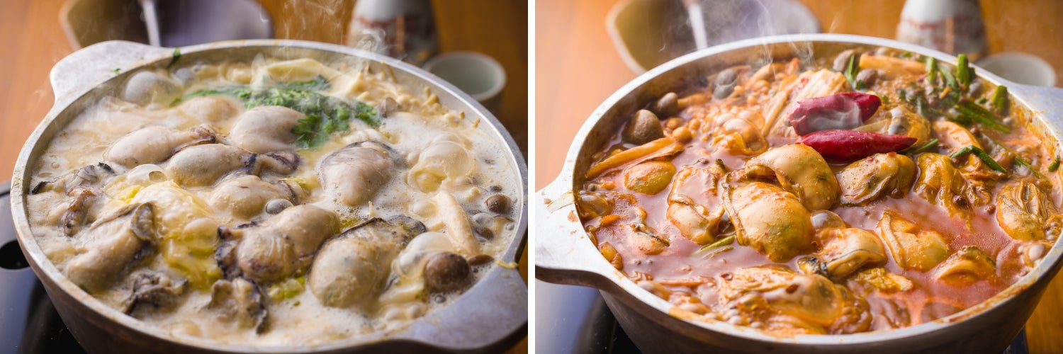 当店の牡蛎鍋は、広島県産の大粒の牡蠣をふんだんに使用しており、他に類を見ない贅沢すぎる仕上がりです。お出汁には、牡蠣の旨味を知り尽くした料理長こだわりの“白”と“赤”の二種類をご用意いたしました。