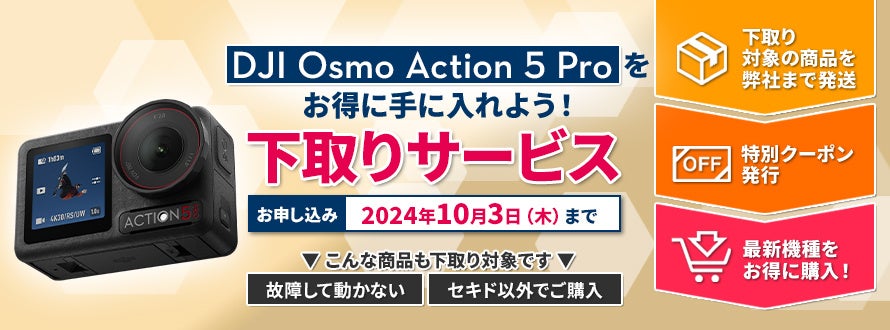 DJI Osmo Action 5 Pro への買い替えがお得な、アクションカメラ・小型カメラの下取りサービスを10月3日(木)まで実施いたします。故障して動かない製品、セキド以外で購入された製品も下取り対象です。下取り製品到着後に DJI Osmo Action 5 Pro 購入時にご利用いただける特別クーポンを発行いたします。この機会にぜひご利用ください。