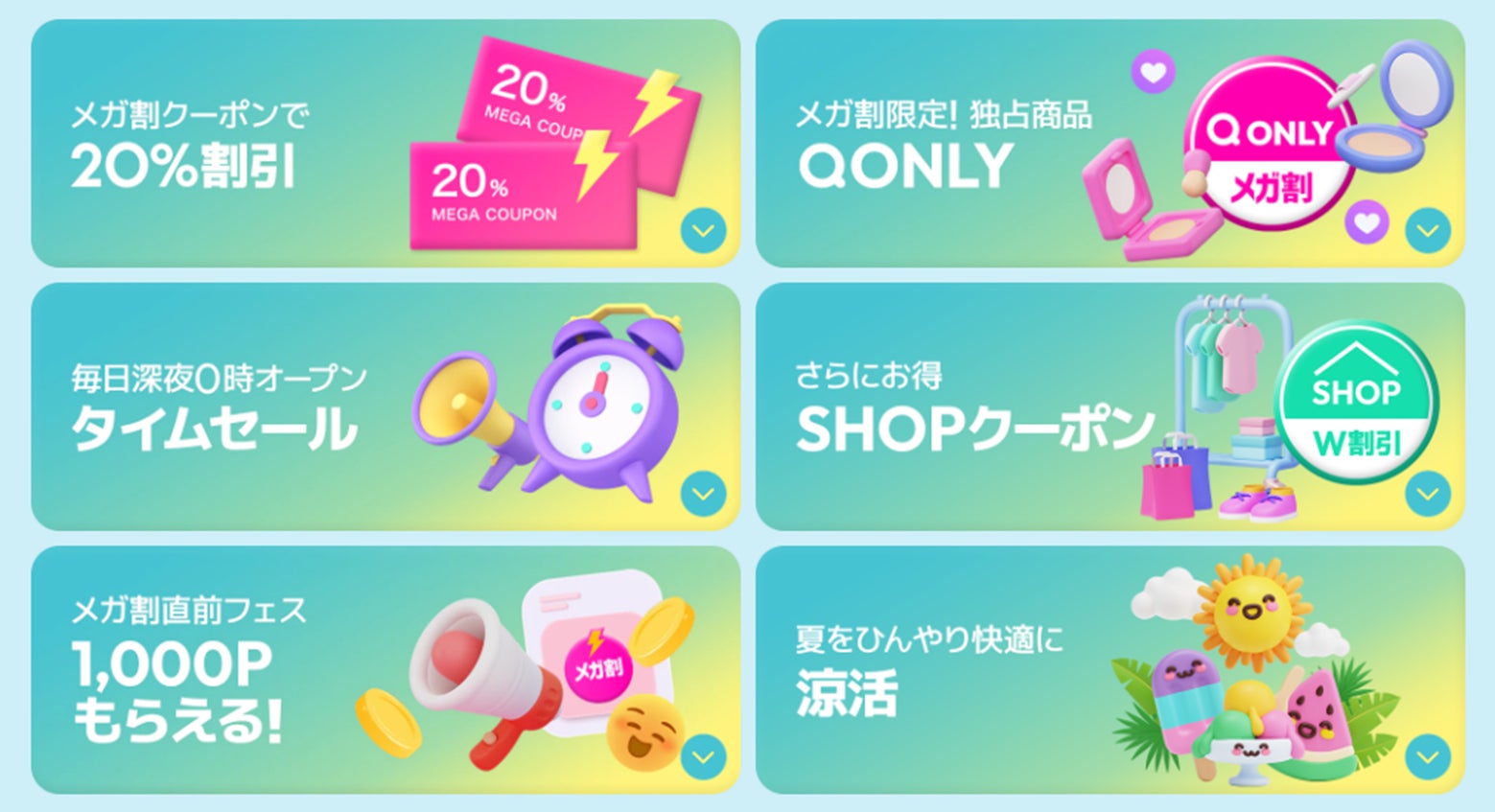 今回のQoo10のメガ割では、夏のお出かけや旅行、快適なおうち時間に向けて役立つお得で魅力ある商品を取り揃え、お客様の欲しい商品がより手軽に楽しくショッピングできるよう、盛り上げていきます。