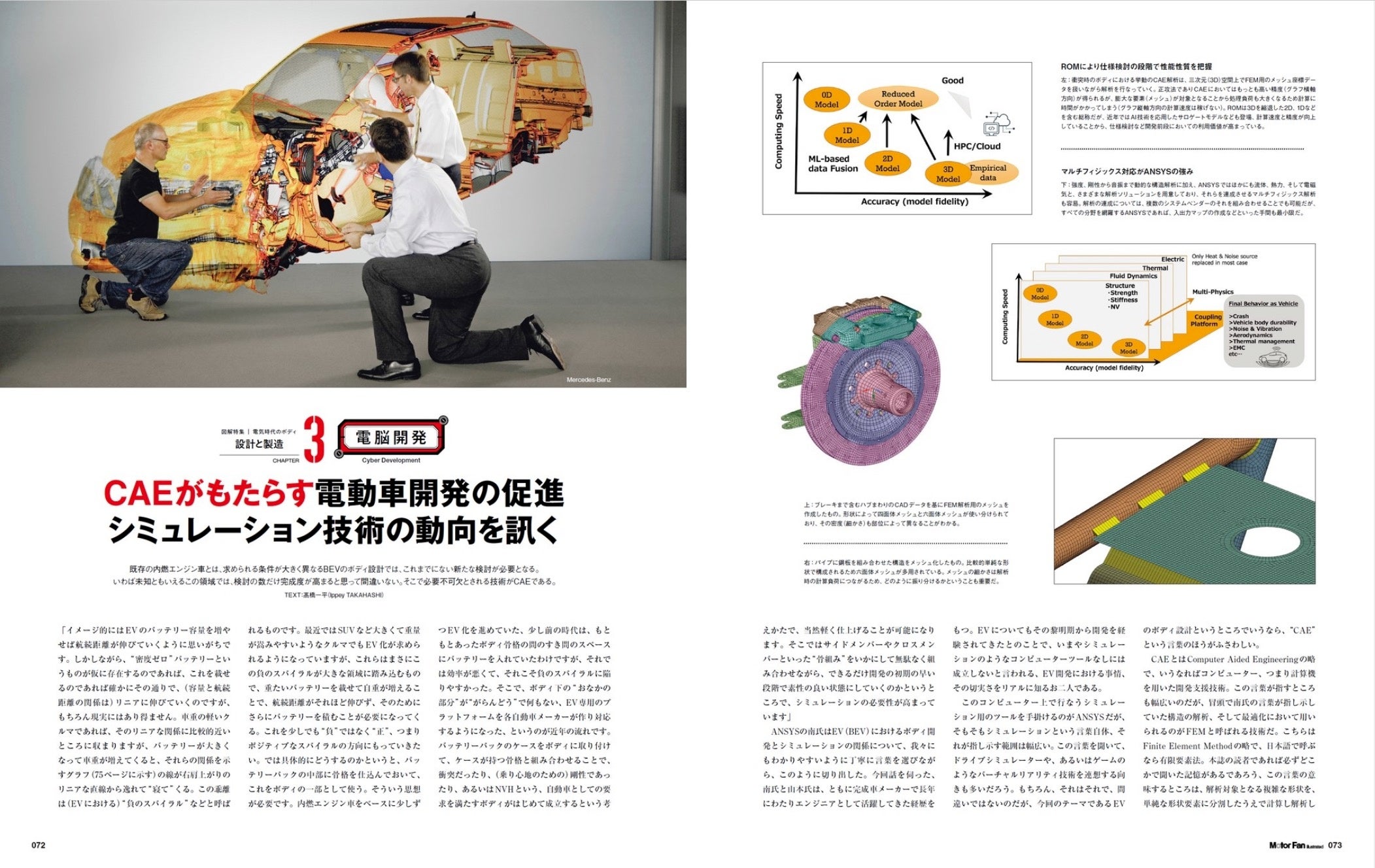 続くChapter 3では、これらボディを仕立てるプロセスに着目したコンテンツとしています。シミュレーションではそれらをどのように効率的に解決し、最大効率を得る設計としているのか。アンシスにシミュレーションをテーマに取材しました。そしてボディ部材。ユニプレスに「強くて軽いのに冷間でプレス」「衝突時に『ここだけつぶれる』複合材」という、世界でも最高峰のスチールテクノロジーについてお話をうかがいました。