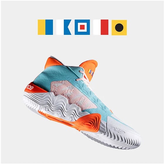 デザイナーはJonathan Grondinで海からインスパイアされた印象的なブルーとオレンジのカラーリングは、穏やかな海の風景と太平洋に沈む夕日を連想させます。ウェーブのステッチを配したユニークなディティールのインソールが特徴的で、シュータンに描かれた航海の旗に「カワイ」、もう片足に「レナード」と記されています。