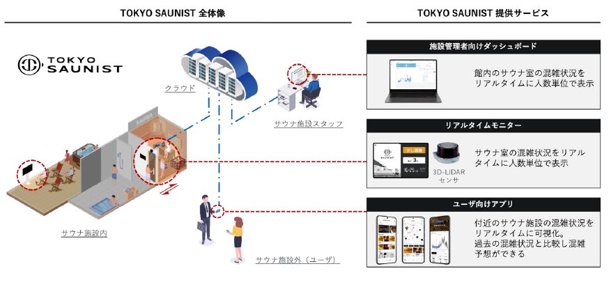 「TOKYO SAUNIST」は、サウナ室前に設置した3D-LiDARセンサ(*1)で高精度に人を検知し、クラウドにデータを集約します。集約したデータを用いてリアルタイムでサウナ室内の混雑状況を可視化し、サウナ利用者および施設管理者向けにアプリケーションを提供するクラウド型のサービスです(特許出願中)。