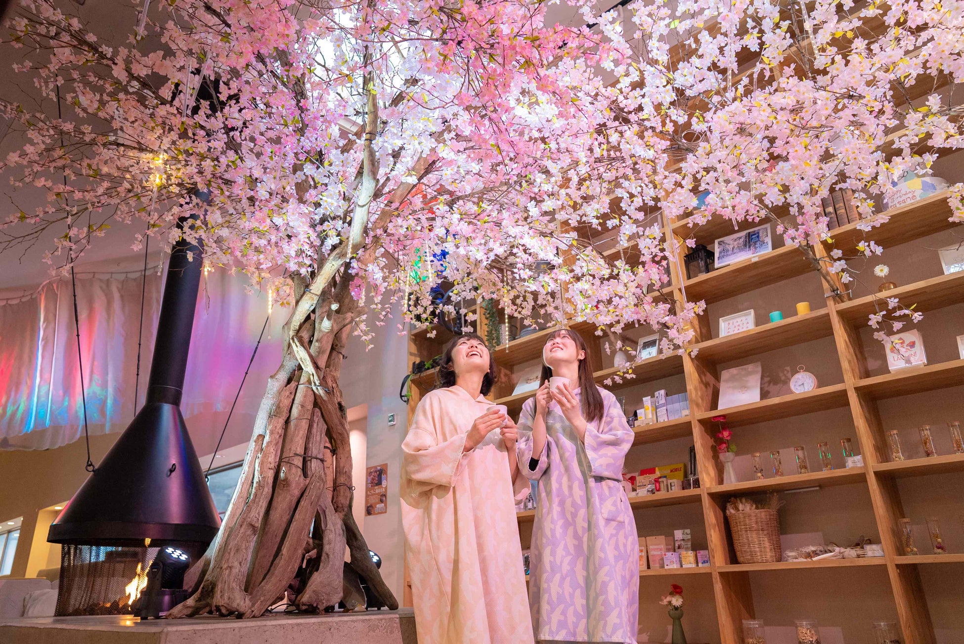 暖炉ラウンジには巨大な桜ツリーが登場。毎日19:00〜は館内が暗くなり「夜桜イルミネーション」を開催。オーロラの光とピンクの桜が光り輝く幻想的な空間が広がります。また、巨大桜ツリーの下にリアルな桜吹雪が舞い散る「桜chillタイム」も毎日開催します。