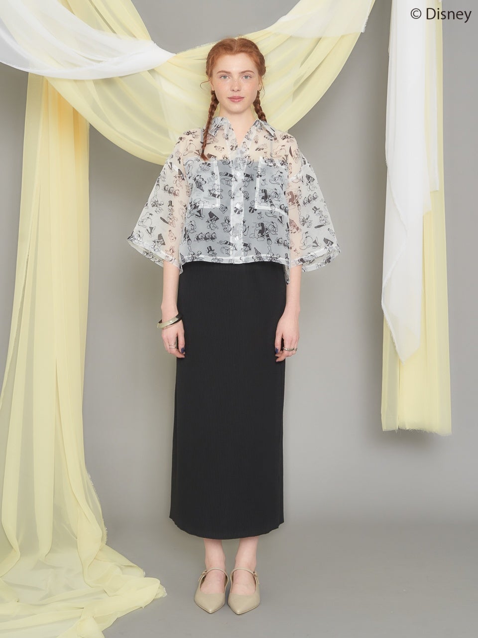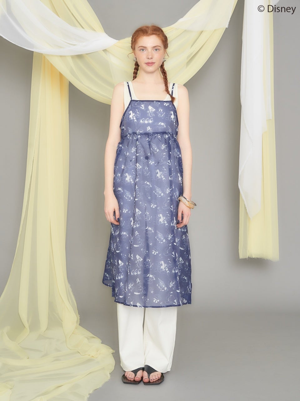 特に目を惹くアイテムは、ドナルドダック・ファミリーの総柄が施されたシアー素材のワンピースとシャツです。ワンピースは、ふわっと広がるフェミニンなシルエットで女性らしさを演出。背中のリボンがコーディネートのアクセントになっています。シャツは、トレンドのクロップド丈を採用。身幅や袖幅はワイドシルエットにし、ゆったりと着ていただけます。
