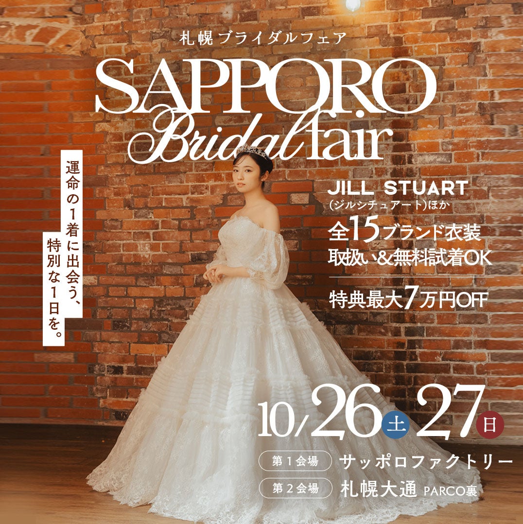 10月26日(土)-27日(日)開催の札幌ブライダルフェア。サッポロファクトリーと札幌大通にある札幌中央店の2会場で開催。最新衣装の見学&無料試着のほか、お得な限定特典をご用意。