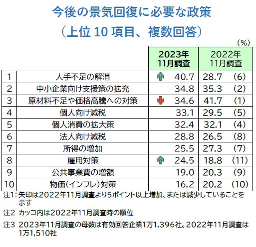 今後の景気回復に必要な政策、「人手不足の解消」が前年より大幅に高まり40.7%(前年比12.0ポイント増)でトップに(複数回答)
