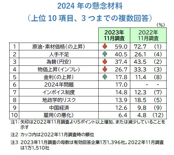 2024年の景気への懸念材料、「原油・素材価格(の上昇)」が59.0%でトップも前年から13.7ポイント低下した(複数回答3つまで)。次いで「人手不足」(40.5%)が前年より急増