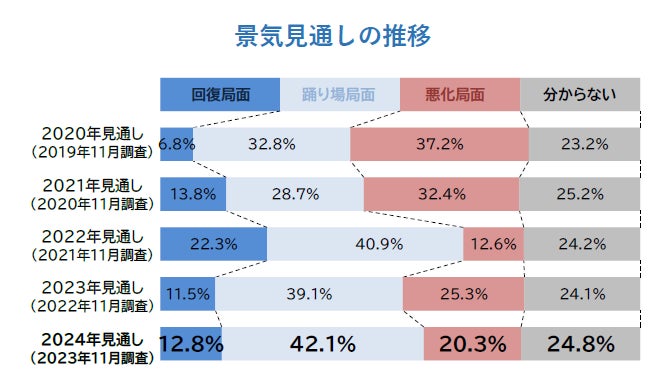 2024年の景気、「回復」局面(12.8%)、「踊り場」局面(42.1%)は前回調査(2022年11月)からそれぞれ上昇。他方、「悪化」局面(20.3%)は5.0ポイント低下