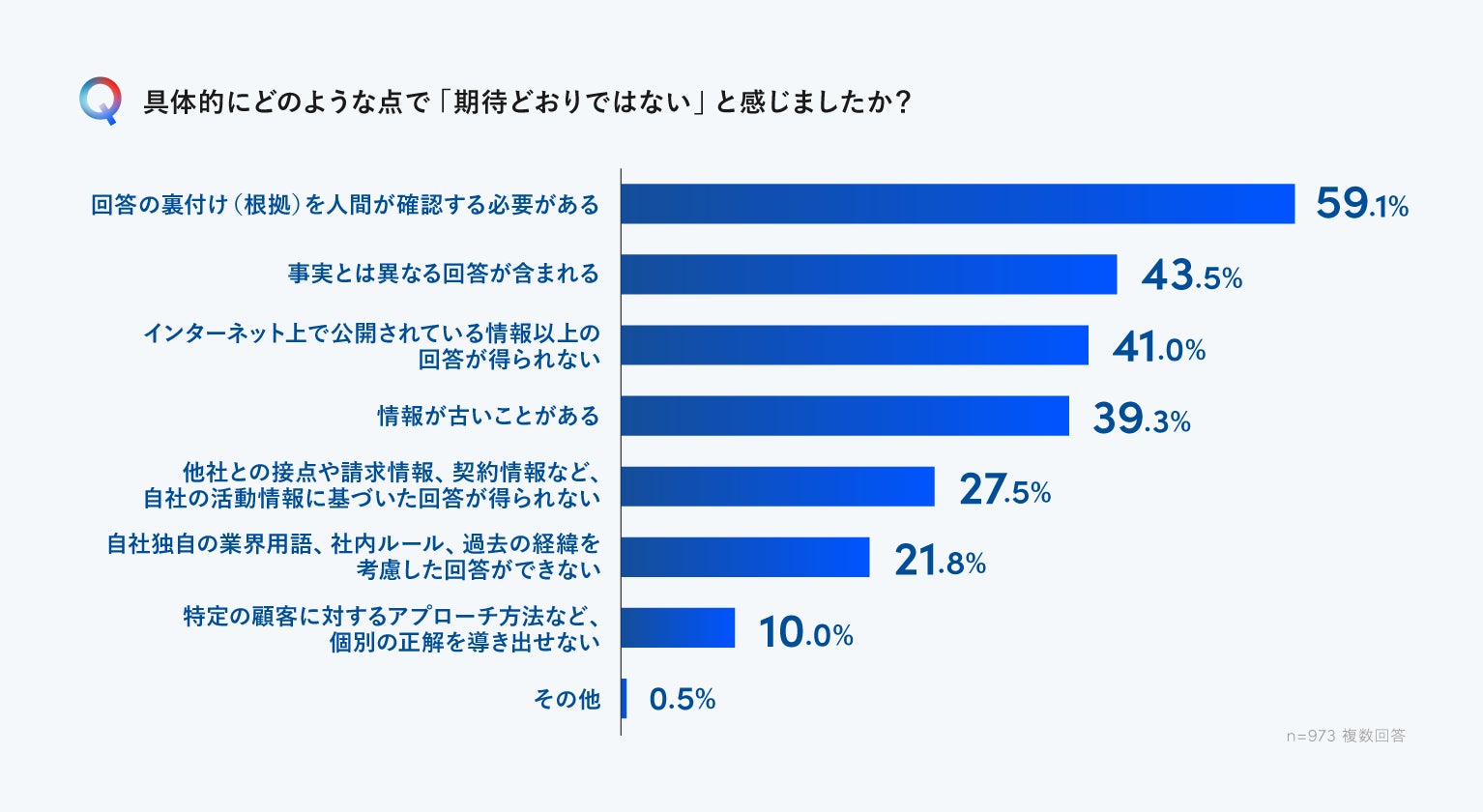 そう感じた理由として、「回答の裏付けを人間が確認する必要がある(59.1%)」「事実とは異なる回答が含まれる(43.5%)」に次いで「インターネット上で公開されている情報以上の回答が得られない(41.0%)」。次に「情報が古いことがある(39.3%)」、次いで「他社との接点や請求、契約情報など、自社の活動情報に基づいた回答が得られない(27.5%)」という順でした。