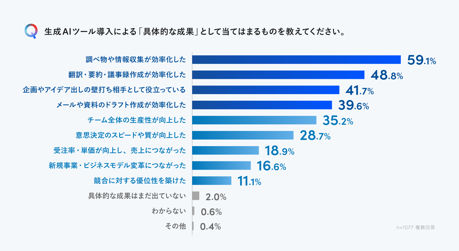導入の効果としては、調べ物や情報収集、各種資料やメール作成など、個人レベルの業務が効率化したという回答が多かった一方、経営インパクトにつながる成果に関しては「受注率・単価が向上し、売上につながった(18.9%)」「新規事業・ビジネスモデル変革につながった(16.6%)」「競合に対する優位性を築けた(11.1%)」という結果でした。