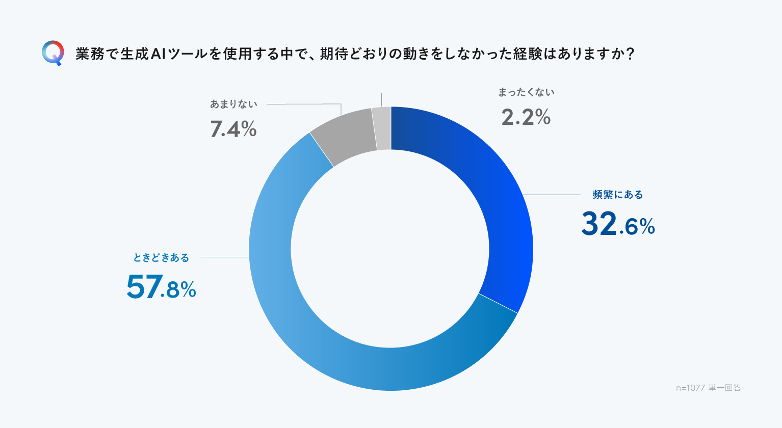 業務で生成AIツールを利用する際、期待どおりの動きをしなかった経験があると回答した人は「頻繁にある(32.6%)」「ときどきある(57.8%)」を合わせると90.4%にのぼりました。