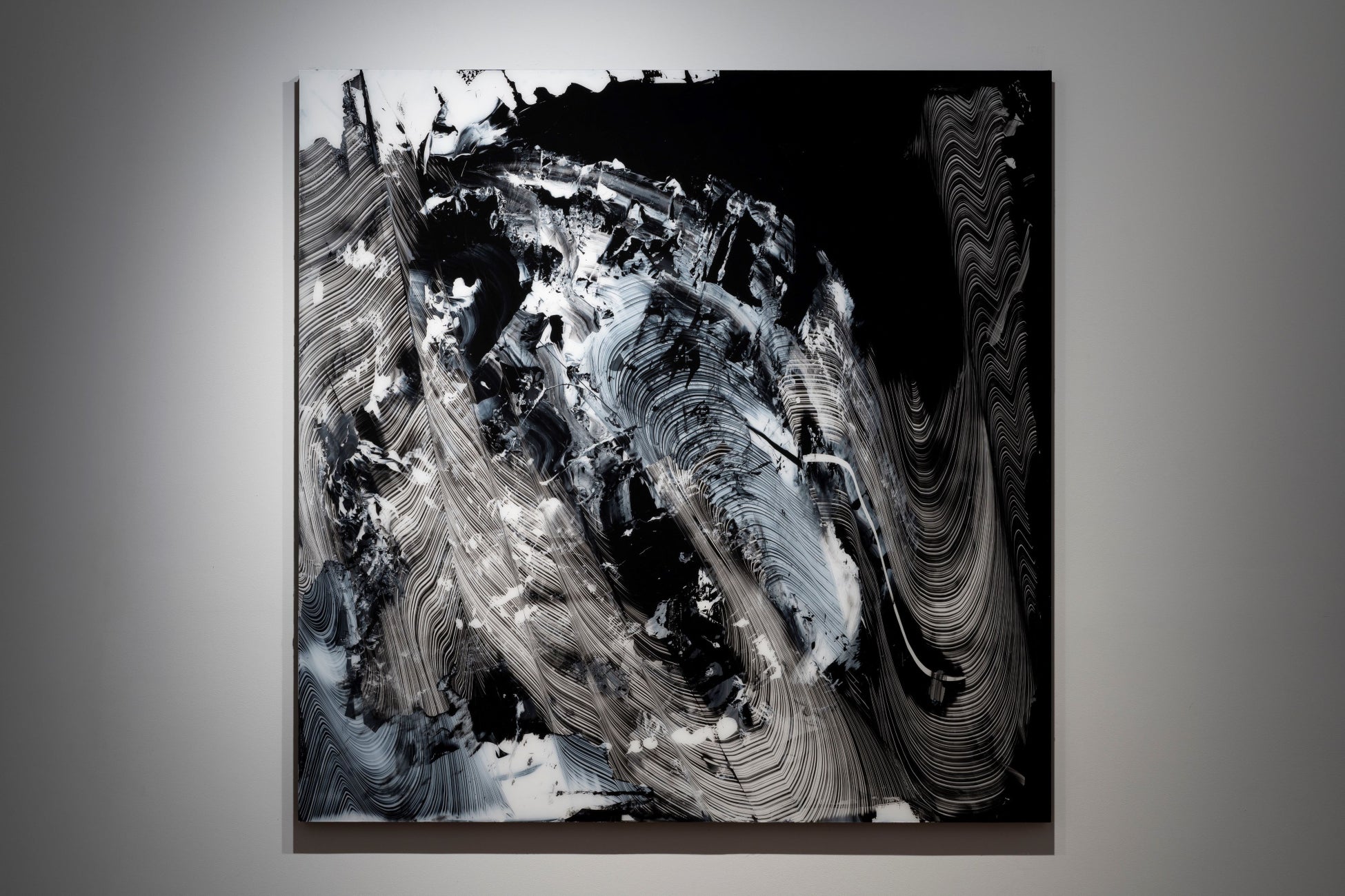 清川漠は、「獏嵌(ばくがん)」という独自の技法を用い、境界線をテーマに作品制作を 行うアーティストです。学生時代、絵画‧版画‧彫刻を学んだ経験から、銅版画の技法と直接書き込む絵画表現を混交させた彫刻作品として、「獏嵌」を生み出しました。獏嵌は、アクリル板を支持体とし、その裏面に塗料をあらかじめ塗り、それを彫り掻くことでラインを描いています。さらに、彫られたラインへ塗料を流し込み、反対側の表面から鑑賞させることで、よりシャープな描写を可能にしています。アクリル板の「裏側」から掻いているため、鑑賞者が眼にする画面は反転したイメージとなり、その偶発性も清川の作品の特徴のひとつです。