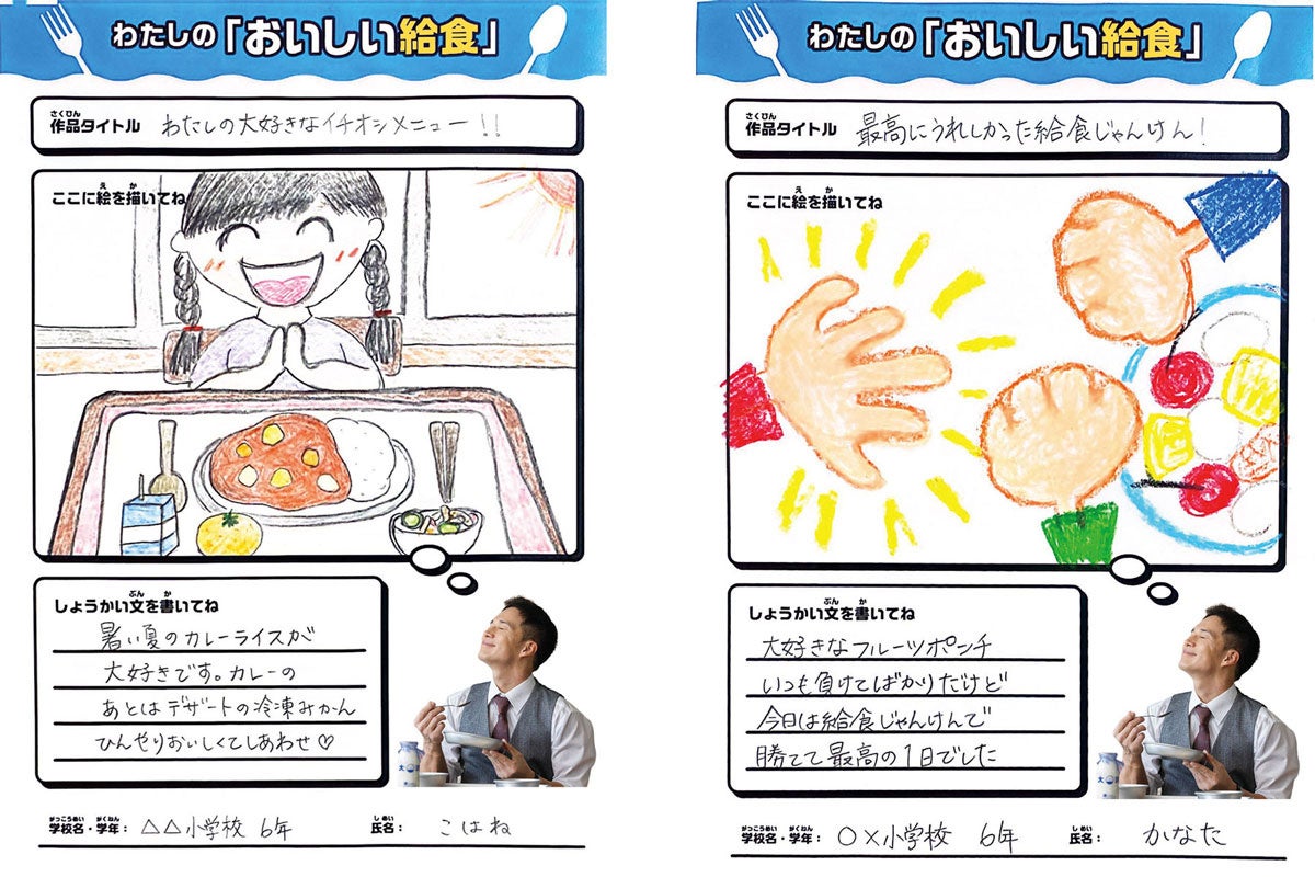 『わたしの「おいしい給食」コンテスト』では、子どもたちがそれぞれに思う「おいしい給食」を絵と一言推薦文で紹介する作品を募集。「自慢したいご当地メニュー」「給食の時間の楽しみ」「お気に入りの食べ方」など、給食にまつわるテーマであれば内容は自由です。