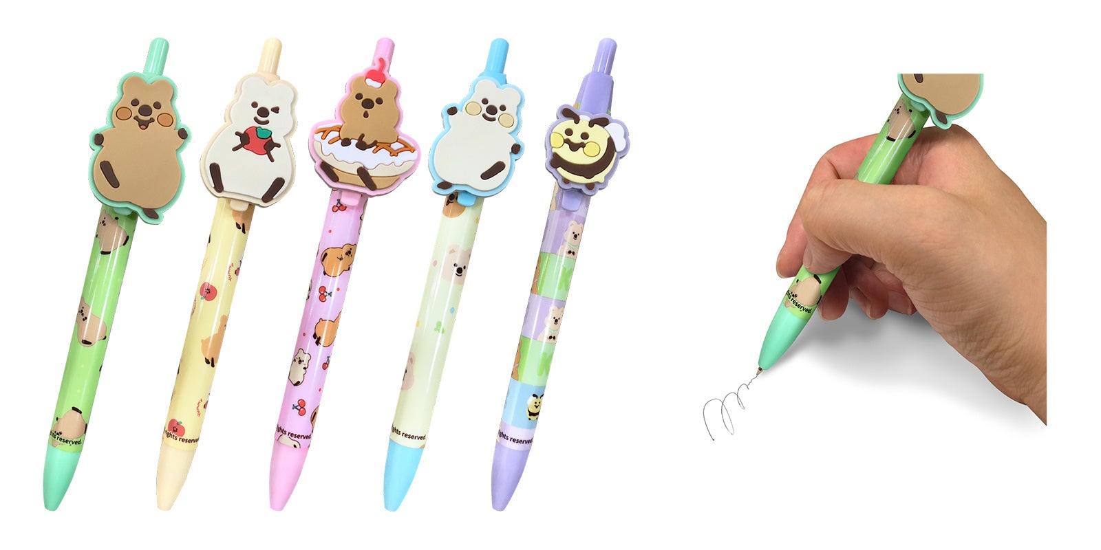 「キキ」、「ハピ」、「バンビー」の様々なポーズのラバーマスコットが付いたボールペン。