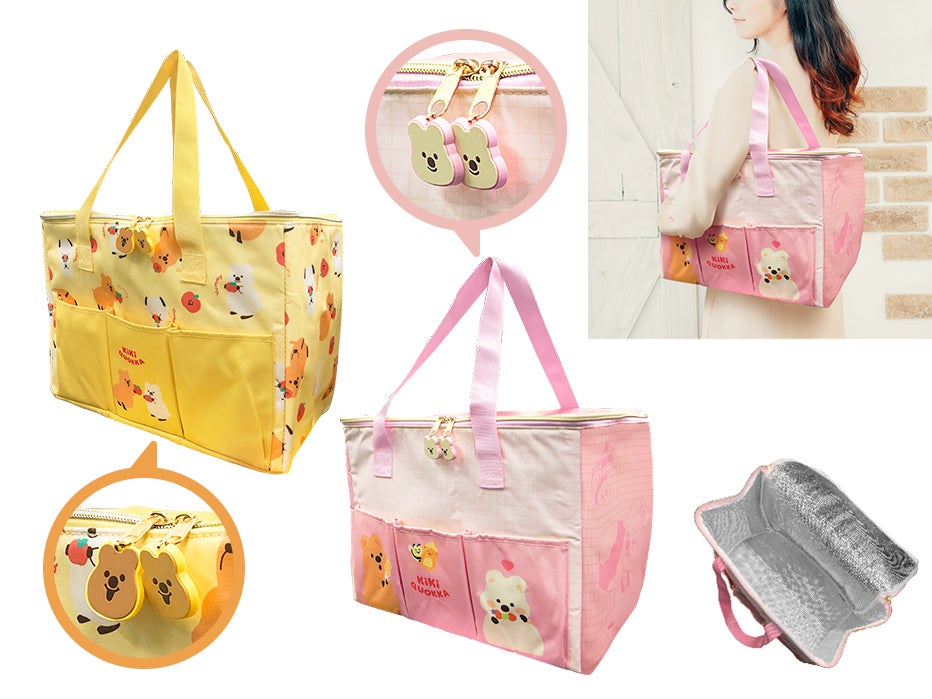 「キキ」と「ハピ」がデザインされた大容量の保冷保温マルチバッグ。