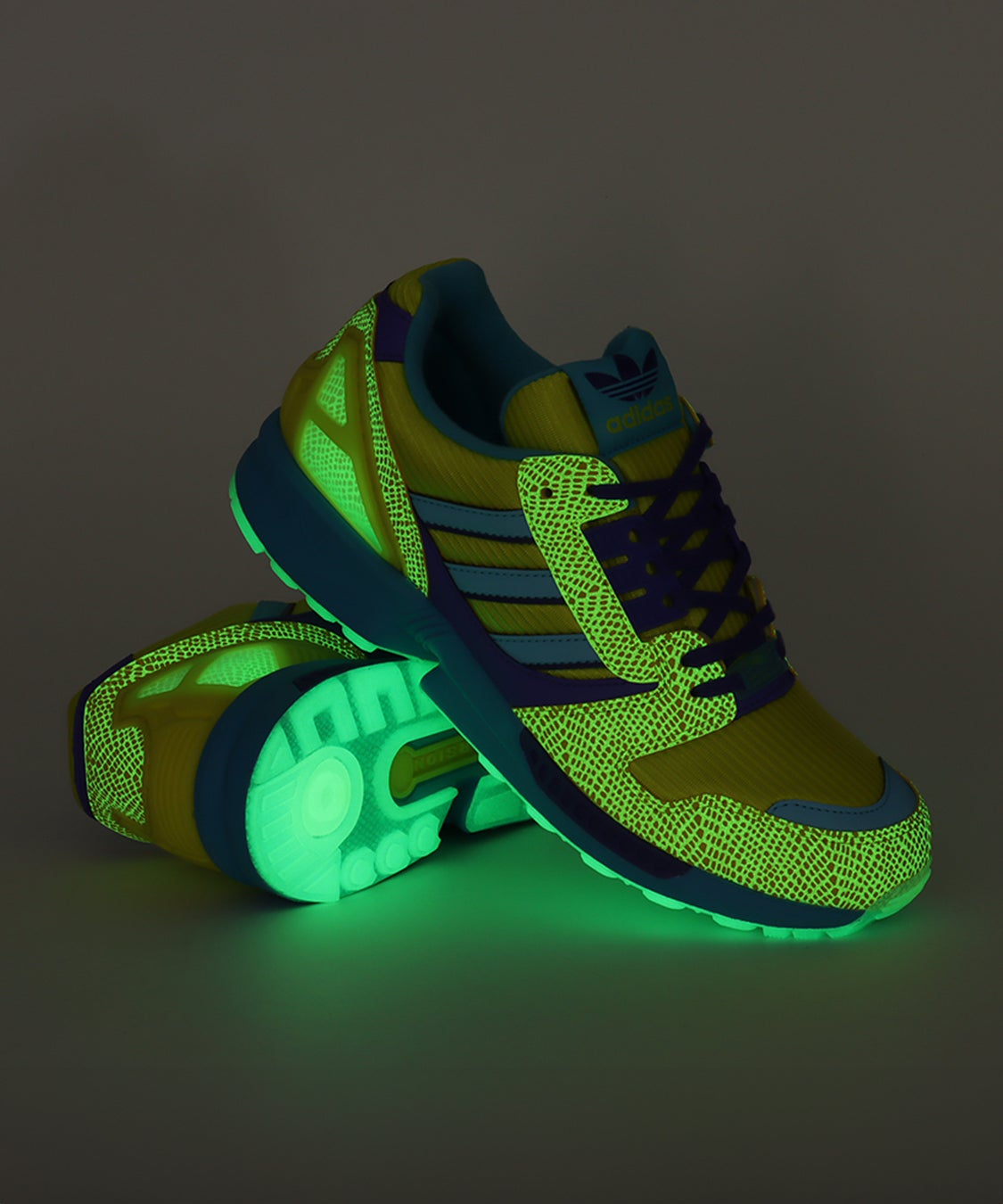 atmos別注の”ZX 8000”は、1作目から通称”GID-SNK(GLOW IN THE DARK-SNAKE)”と呼ばれるパターンを落とし込んでおり、スネークスキン状の”GLOW IN THE DARK(蓄光)” の素材と、リフレクターパーツを纏わせています。