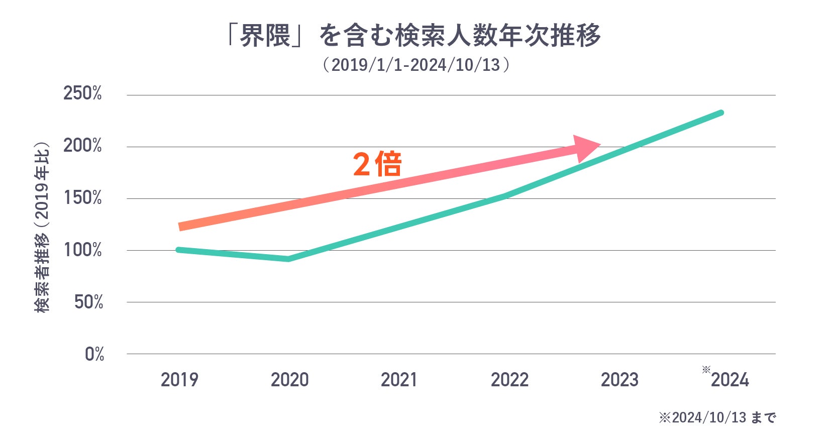 「Yahoo!検索」のビッグデータから、「界隈」を含むキーワードを検索している人数の年次推移を調査したところ、年々増加しており、2024年には10月13日時点にもかかわらず過去最高であることがわかりました。