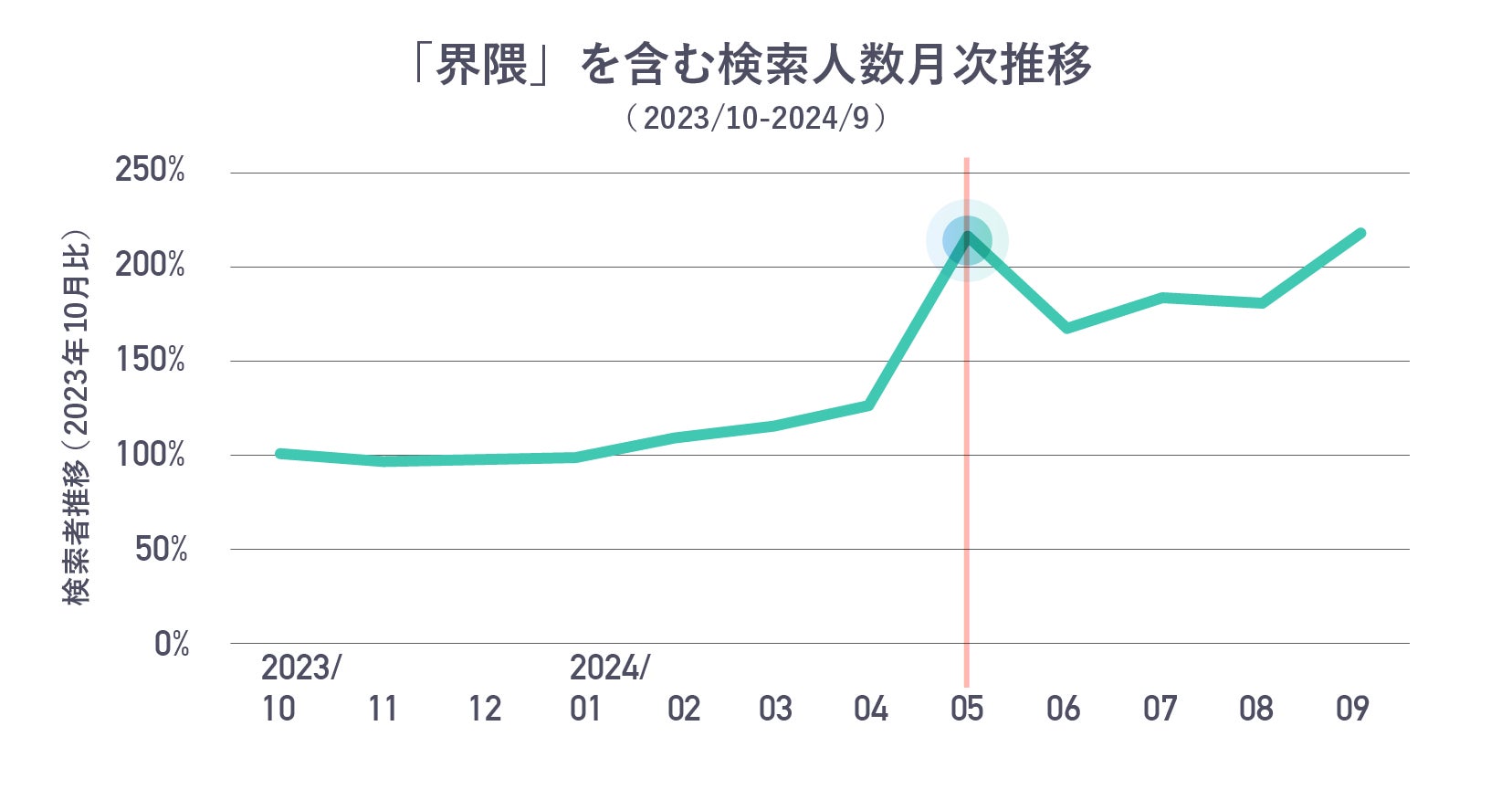 また、さらに細かく確認したところ、2024年5月に「界隈」を含む検索人数が大きく伸び、2023年10月の2倍以上となっていることがわかりました。この月に最も検索されていたキーワードは「風呂キャンセル界隈」でした。「風呂キャンセル界隈」とは、お風呂に入ることを面倒臭いと感じキャンセルする人々を指し、SNSなどでよく使われるようになった言葉です。「睡眠キャンセル界隈」などの派生語も登場していました。