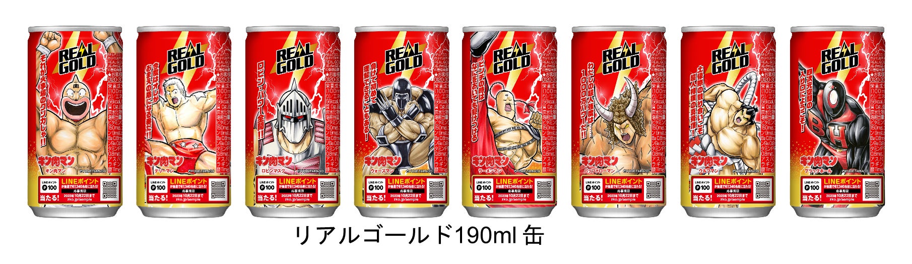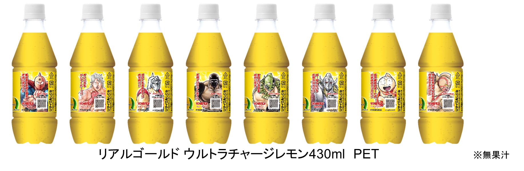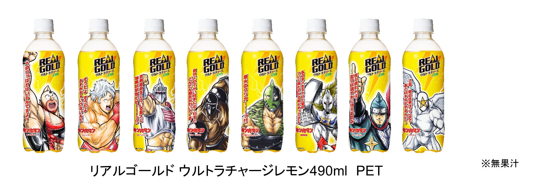 今回の“元気超人ボトル”は、特に作中で人気の高いキャラクターを厳選し、イラストとあわせて、パワーが不足しているときに勇気づけてくれるような「元気超人名セリフ」をパッケージにデザインしました。エナジー・栄養成分のローヤルゼリーエキス、高麗人参エキス、ビタミンB群※2、ビタミンCなどを配合した厳選された栄養成分で、楽しく生きるための元気がチャージできるエナジードリンクである「リアルゴールド」と「リアルゴールド ウルトラチャージ レモン」の2製品で展開します。