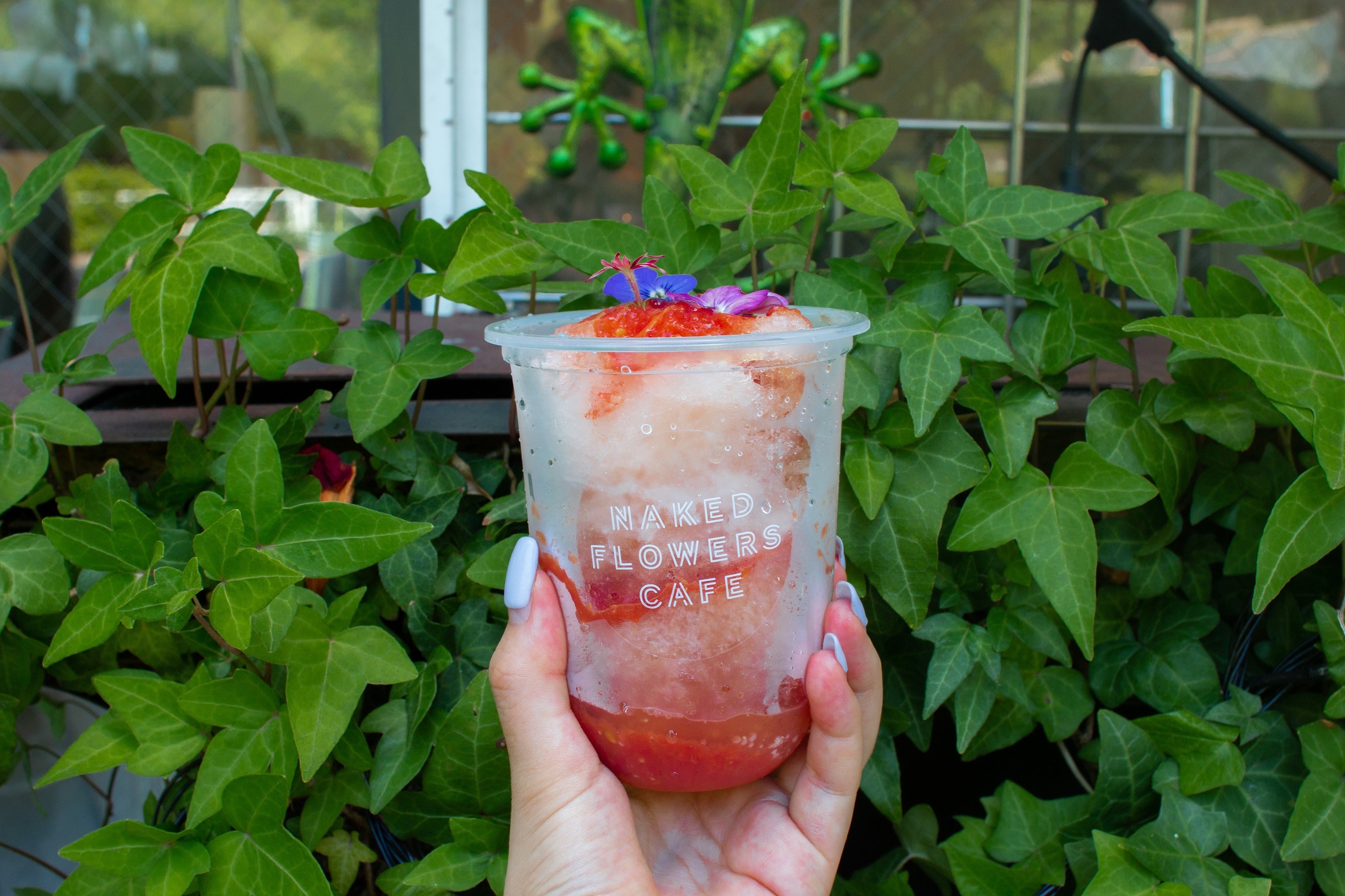 NAKED, INC.が手掛ける、食×アートの体験型レストラン「TREE by NAKED yoyogi park」で発売開始してから、人気メニューの仲間入りをした「自家製かき氷」は、フランス・リヨンで修行を積んだ谷口海志シェフによる自家製シロップが人気の秘訣となっています。その「自家製かき氷」をベースに、本施設の「FLOWERS(花)」らしくエディブルフラワーをあしらい、食べやすい手ごろなサイズ感でメニュー化しました。サステナブルカフェをコンセプトにしているNAKED FLOWERS CAFEならではの環境に配慮した容器で提供します。