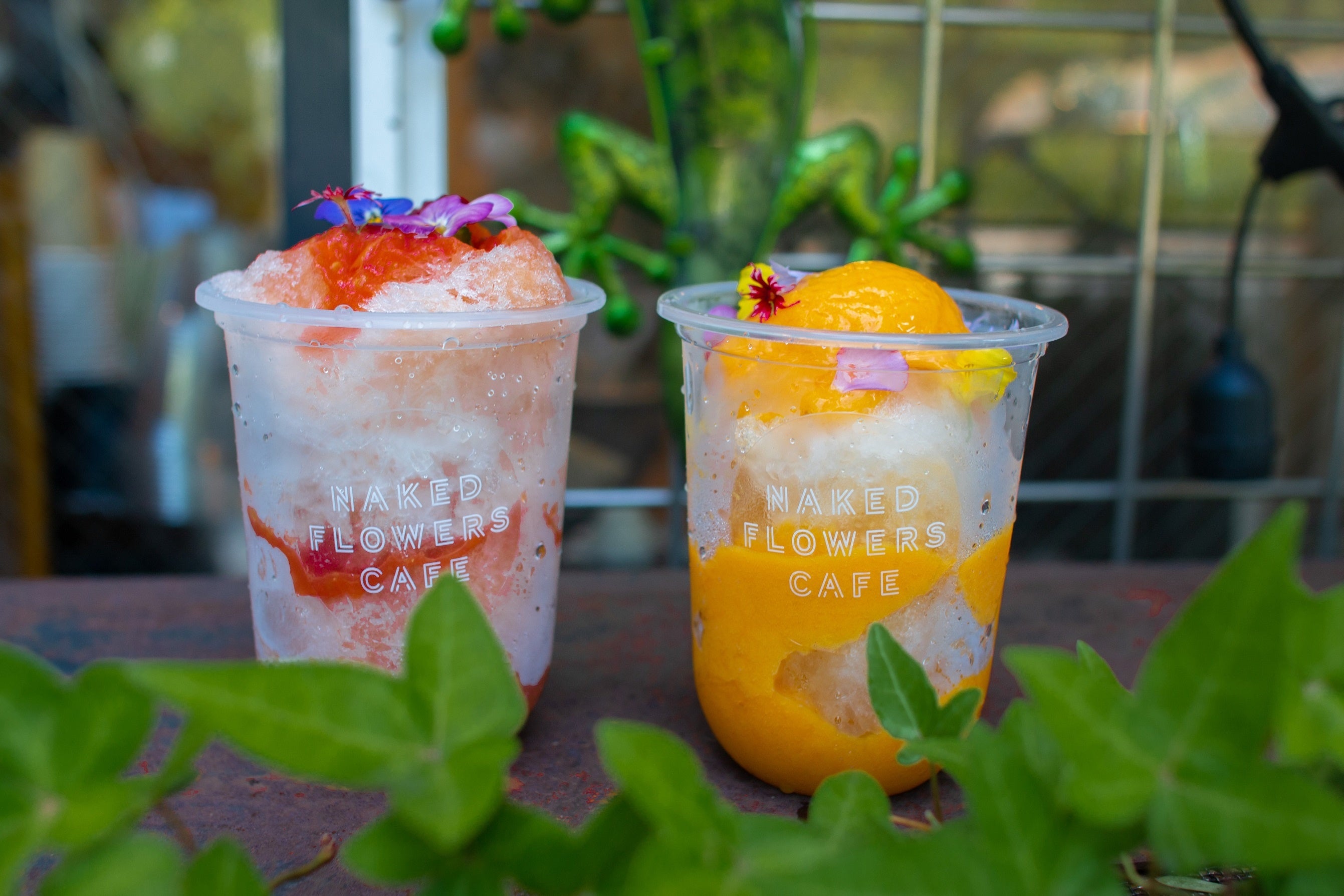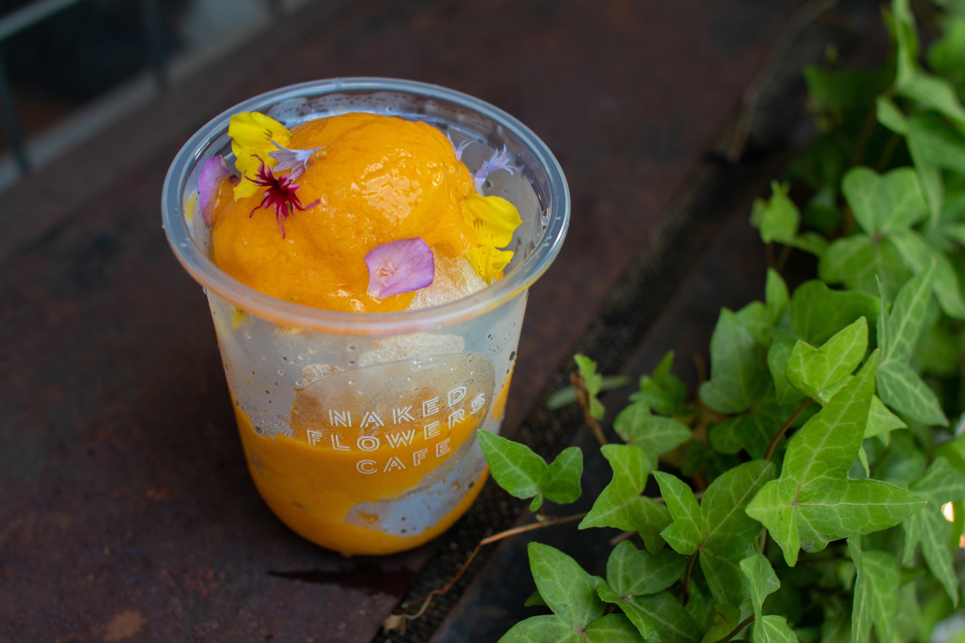 マンゴーのかき氷は、完熟マンゴーとパッションフルーツに青レモンの甘酸っぱいソースで後味はさっぱりながら、旬のフルーツを感じるスイーツです。今年の夏は、『NAKED FLOWERS FOR YOU』を体験した人も、涼みにNAKED FLOWERS CAFEに立ち寄った人も、是非『FLOWERSかき氷』を食べて、厳しい猛暑を乗り切って!