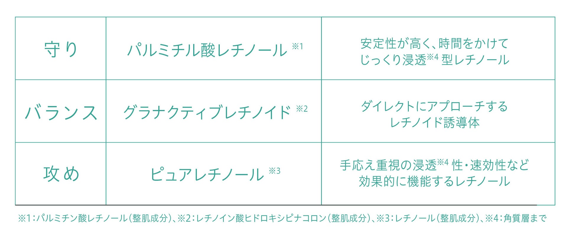 また、肌体感を大切にしながらも、負担を最小限に抑えるため相性の良いレチノール*5を3種類厳選しました。