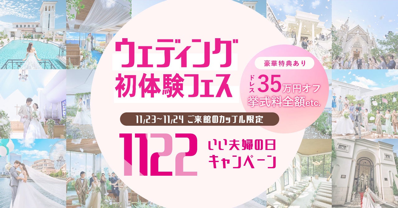 11月23日24日に開催の『ウェディング初体験フェス』におふたりでご来館されたお客様限定で、挙式料金全額プレゼント・ウェディングドレス35万円オフなど特別な特典をご用意。よりお得にご結婚式を叶えていただけます。