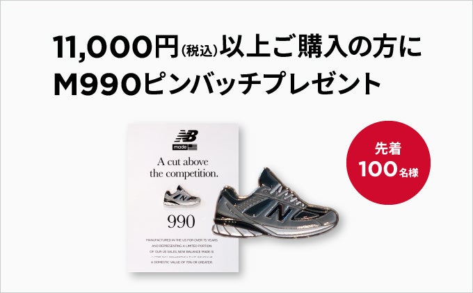 ニューバランスのフラッグシップモデルであるMade in USAの「M990v5」を模したスペシャルなピンバッチを11,000円(税込)以上ご購入の先着100名様にプレゼントいたします。