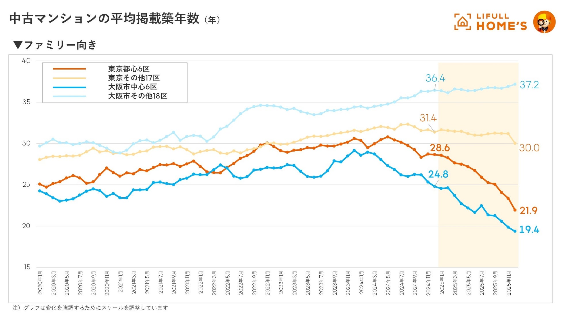 ・掲載築年数は1年間で東京都心部が7年、大阪市中心部が6年若返る