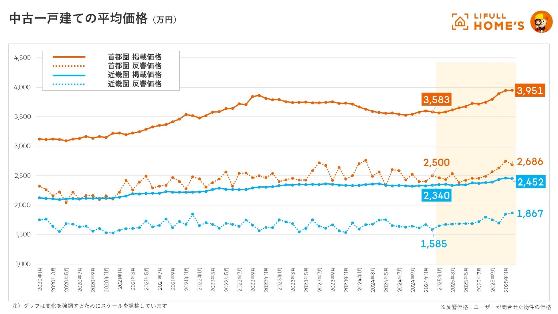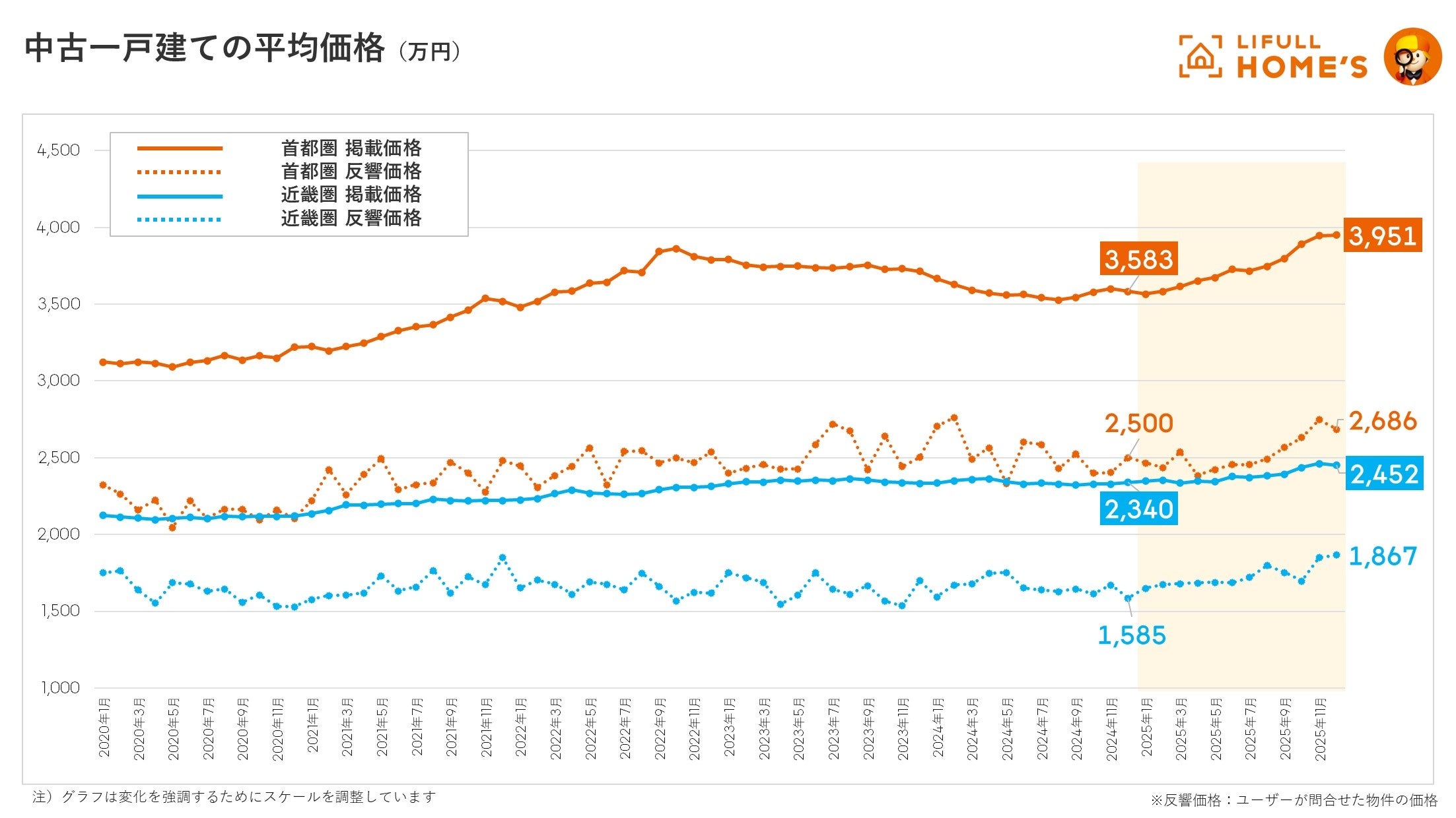 2025年12月の一戸建ての掲載価格は、首都圏で3,951万円(前年同月比+10.3%)となり、2020年の計測開始以降の最高値を更新しました。なお、近畿圏では2,452万円(同+4.8%)となり、こちらも計測開始以降2番目の高さとなりました(最高値は2025年11月の2,462万円)。