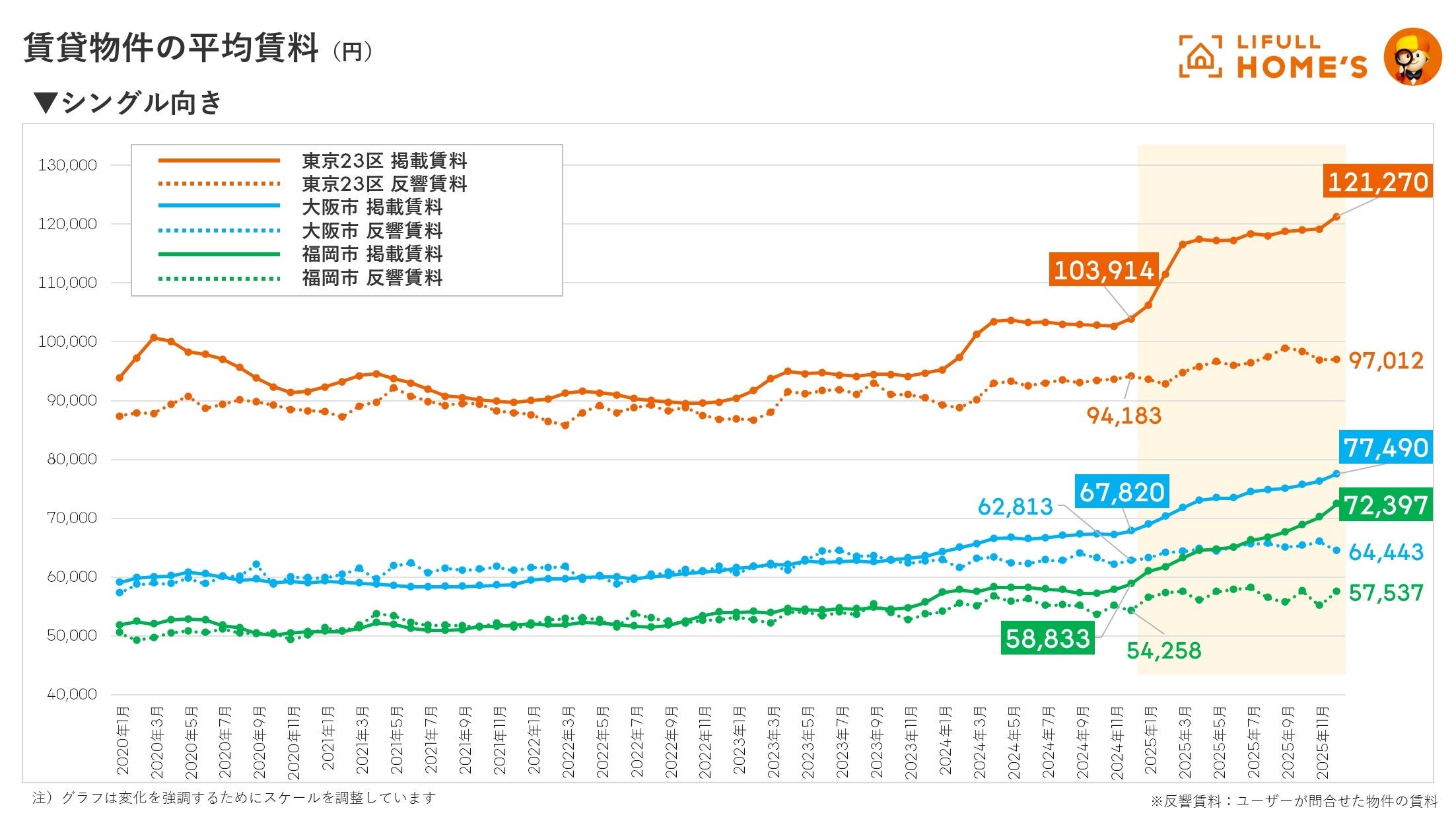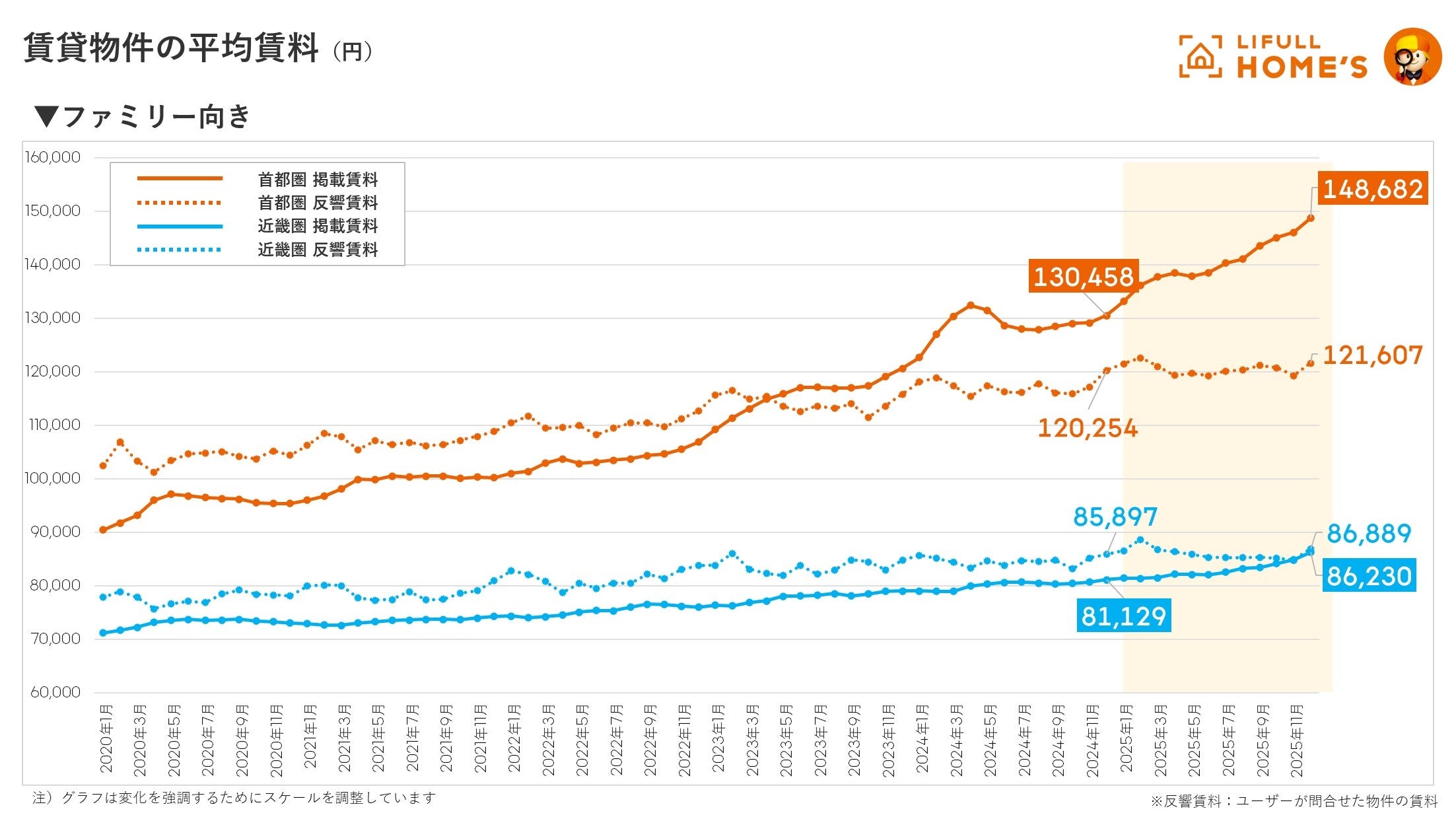 2025年12月の賃貸物件の掲載賃料は、首都圏シングル向きで88,294円(前年同月比+24.8%)、ファミリー向きで148,682円(同+14.0%)、近畿圏シングル向きで62,167円(同+7.5%)、ファミリー向きで86,230円(同+6.3%)となり、いずれも2020年の計測開始以降の最高値を更新しました。