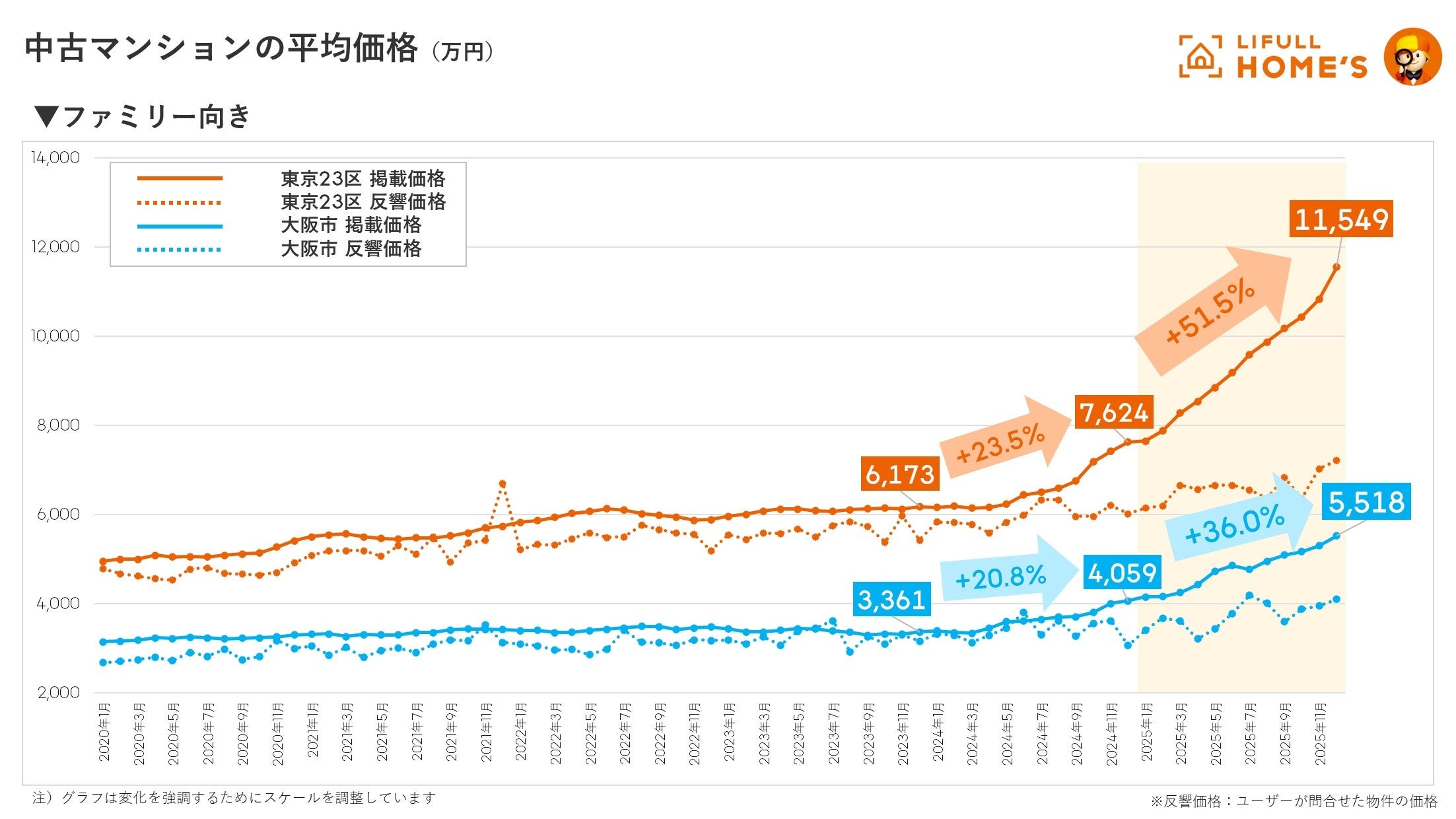 2025年12月の中古マンションの掲載価格は、首都圏(東京都、神奈川県、埼玉県、千葉県)シングル向き5,210万円(前年同月比+41.8%)、ファミリー向き6,012万円(同+41.8%)、近畿圏(大阪府、兵庫県、京都府)シングル向き2,807万円(同+24.1%)、ファミリー向き3,152万円(同+17.8%)となり、いずれも2020年の計測開始以降の最高値を更新しました。