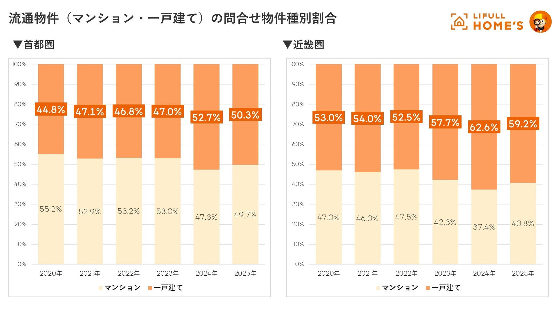 中古一戸建ての掲載価格は、首都圏、近畿圏ともに上昇傾向にありますが、その上昇率は中古マンションと比べると緩やかで、一戸建てとマンションの価格差は拡大しています。こうした状況を背景に、LIFULL HOME'Sに掲載された首都圏のファミリー向き流通物件に対するユーザーからの問合せのうち、一戸建てが占める割合が2024年以降明らかに増加しています(2020年:44.8%→2024年:52.7%)。2025年は50.3%とやや揺り戻しがあったものの、例年と比べると依然として一戸建ての需要は高く、購入ニーズの一戸建てシフトが定着しつつあるといえます。首都圏より比較的安価に土地を購入できることからもともと一戸建ての需要が高い近畿圏においても、問合せに占める一戸建ての割合は拡大(2020年:53.0%→2025年:59.2%)しています。