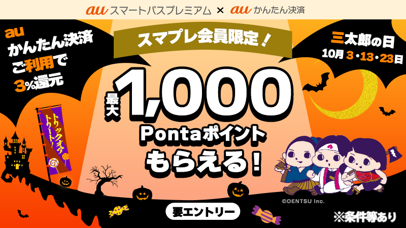 9月に引き続き10月も【 auスマートパスプレミアム会員】なら三太郎の日に「auかんたん決済」で最大1,000Pontaポイント貰えるキャンペーン開催!